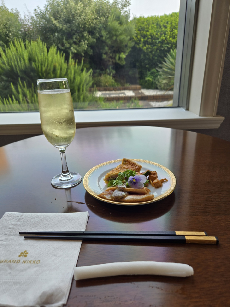 到着時のお抹茶に始まり、日本酒の試飲やアウトドアラウンジでのクラフトビールやホットワインのサービス(おつまみ付き)、朝は、搾りたてのトマトジュースやオレンジジュースのサービスと、全部制覇するには忙しいぐらいのサービスです。