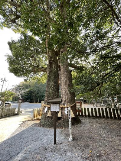 社殿を右に進むと、また大きなクスノキが。このクスノキは1本の幹から二手に分かれていることから「夫婦楠(クスノキ)」と呼ばれています。また、クスノキは子孫繁栄の象徴であることから、神社を訪れる人がこのクスノキを長寿・縁結びの神様と考え、男性は左回り、女性は右回りに1周すると、願いが叶うと信じられているとのこと。