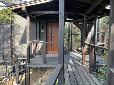 お宿の作りは、宿「離れ社の湯 海いろ別邸」の3棟は斜面の下から順に[十三夜][朔月][宵月]で順に階段が増えます。