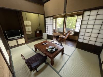 離れのお部屋に向かう廊下から非日常感に溢れていて、スタンダードタイプの離れで、お部屋は玄関+和室12畳+洋室(ツインベッド)タイプで、お部屋のお風呂は、美濃石造りの内風呂と露天風呂、足湯があり、お風呂は天然温泉です。