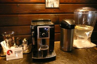 無料のドリンクサービスもあります。コーヒー、紅茶類、ポット、レモンのスライスの入った冷水が、フロントの横のラウンジに毎日準備されていました。