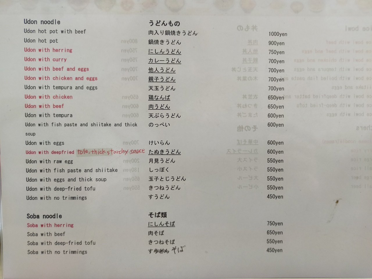看板メニュー?京風のたぬきうどんをはじめ、うどん・そば・丼もの等が食べれます。立地の割に値段設定がお安め。駅から近いので、観光客の方にはお勧め。駐車場は有りません。近くにコインパーキングは数か所有ります。