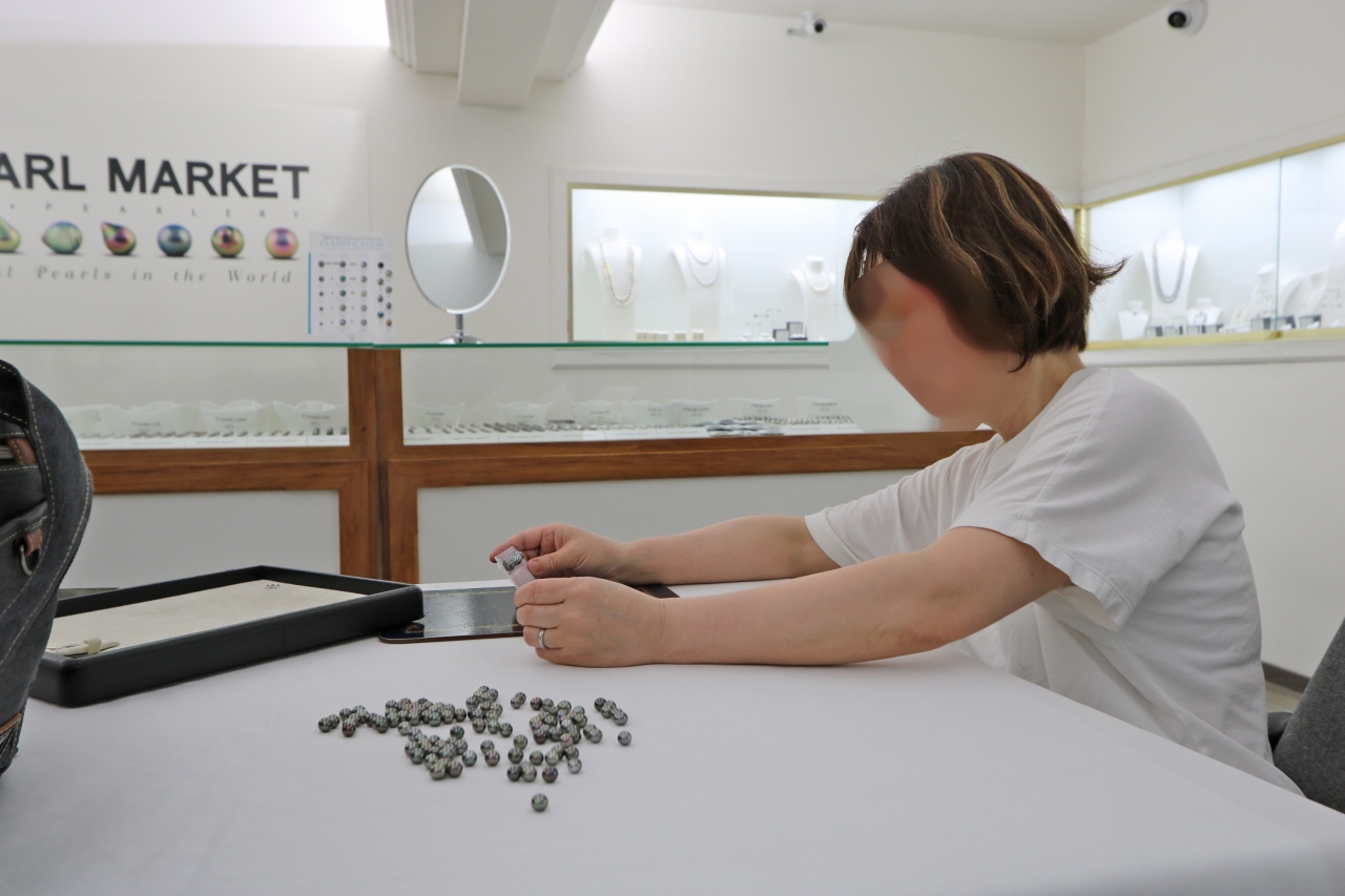 日本人の店員さんがいらっしゃいます。既製品もありますが、自分好みの金具と真珠を組み合わせて作ってくれます。最初に予算をいえば相当のランクの真珠を数十粒もってきてくれ、そこから選んで作りました。加工時間は1時間~かかるので余裕をもってくださいね。