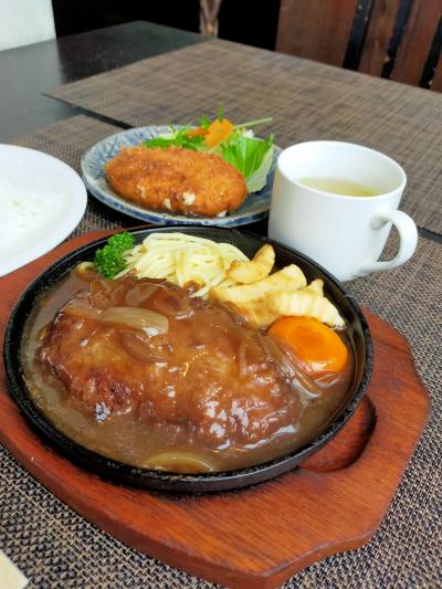 「鉄板焼ハンバーグ特製ソースとカニクリームコロッケ(←選べる)」を注文!