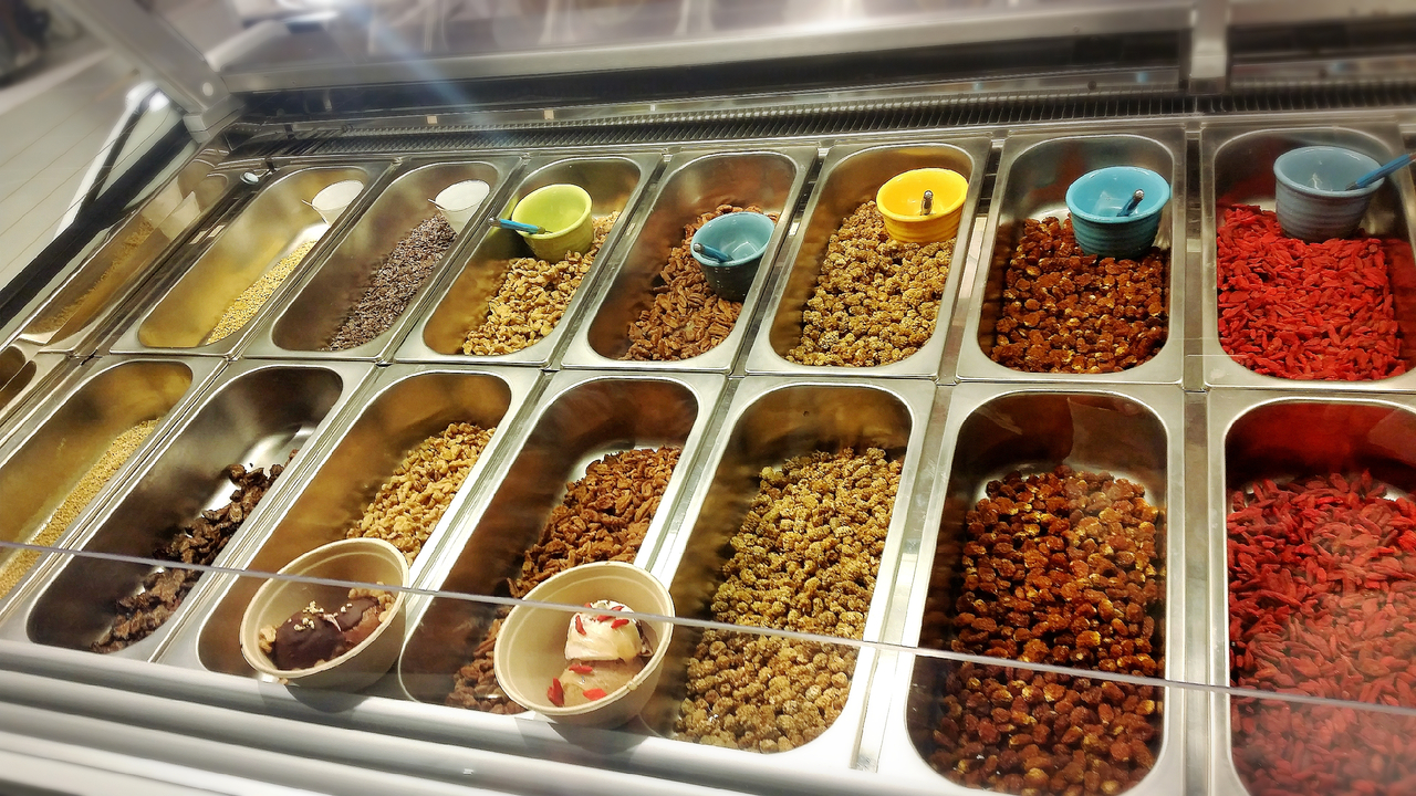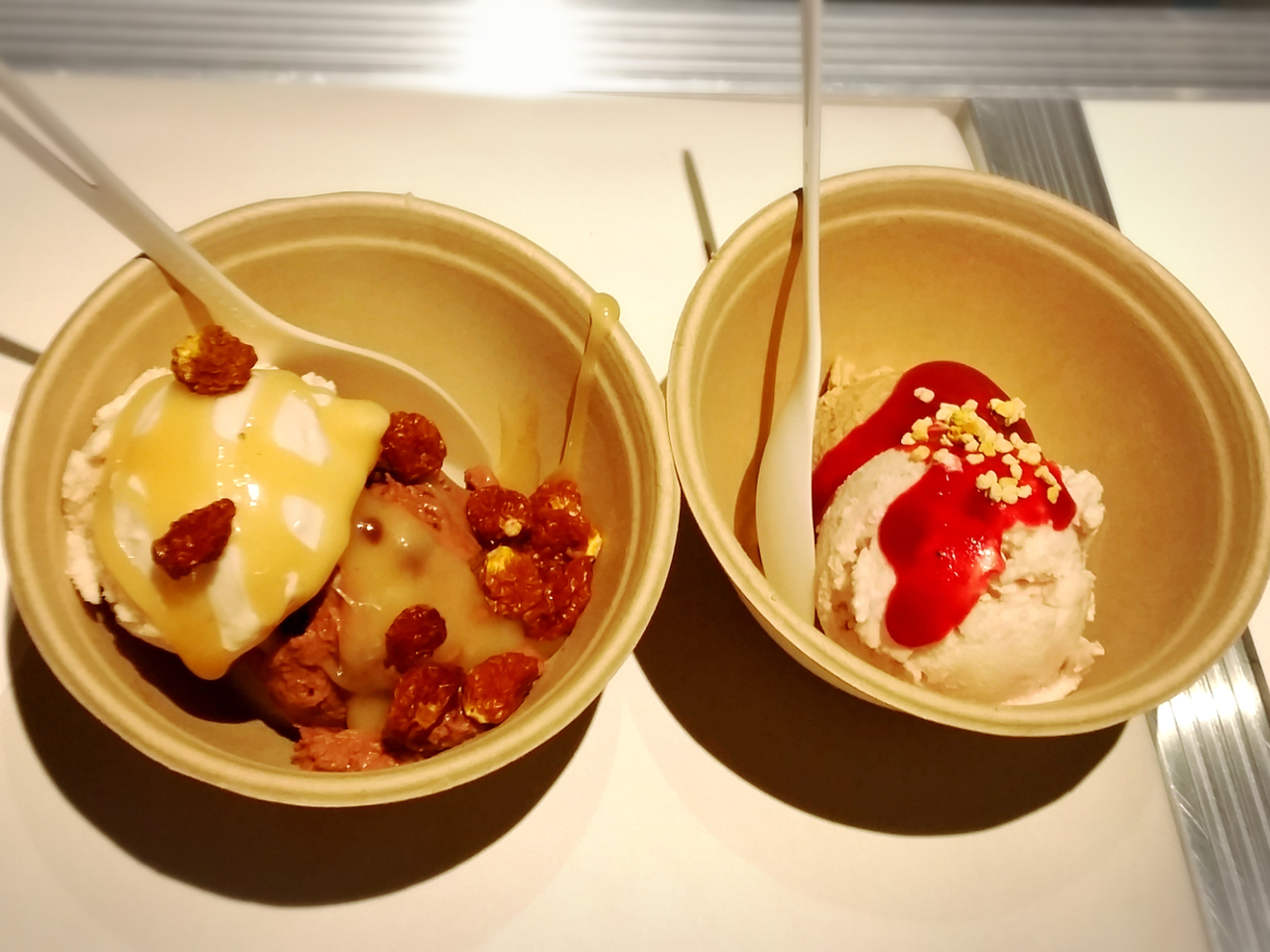 ここはカリフォルニア生まれの乳製品を一切使っていない、世界で初めてのアイスクリーム店です♪(^_^)/乳製品を使っていないのでアレルギーのある方も安心して頂けるオーガニックのアイスクリーム屋さんです♪(^_^)/ベースになるのは、オーガニックのココナッツに生ハチミツで甘さをプラスしたアイスクリームで、ハリウッドセレブにも親しまれているそうです♪(^_^)/今回はベースになるアイスクリームとチョコチップにキャラメルソースを掛けて、ホオズキのドライフルーツをトッピングしてもらいました♪(^_^)/(写真左側)このホオズキのドライフルーツが酸味があり食感はドライイチジクの様なプチプチ感があり美味しかったです♪是非お試しあれ♪o(^o^)o
