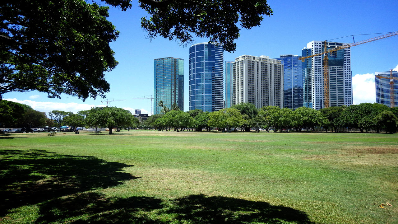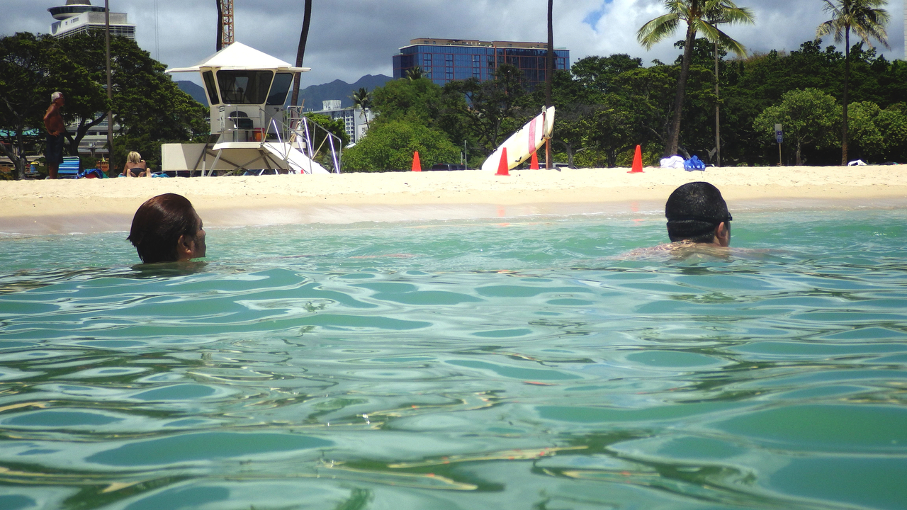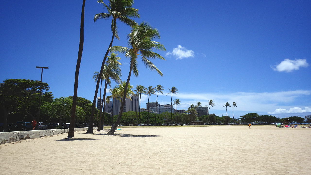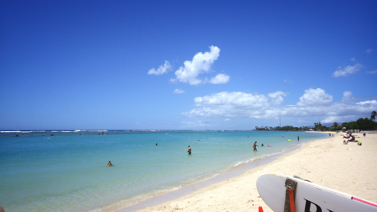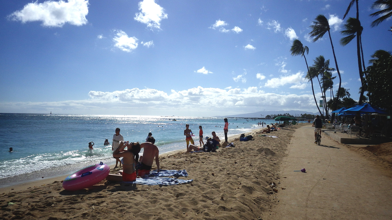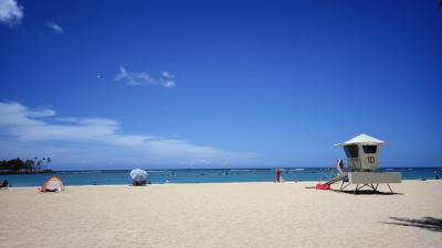ここはアラモアナショッピングセンターの向かい側にある、地元の方の憩の場所です♪(^_^)/普段はワイキキとは違って、波もほとんどたたず、人もまばらにしかいなく、のんびりしていています♪(^_^)/海は砂浜から少し行くと急に深くなるので、泳ぎに自信がない方は浮き輪を利用された方が良いかもしれませんf(^_^;シャワーや、トイレ、海の家的なL&Lハワイアンバーベキューも出来たので、色々揃っていて使い勝手の良い場所なのでオススメします♪(^-^ゞ