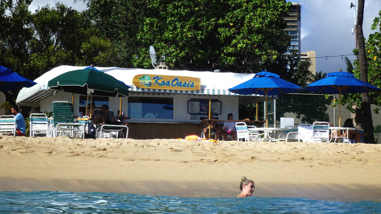 ここはアウトリガーリーフホテルの右側にある、ワイキキとは思えない程空いているビーチです♪(^_^)/本当少しの距離しか変わらないのに、かなりゆったり出来ます♪(^-^ゞシャワーや、トイレ、海の家的なお店もあり、ここはアルコールの提供もしていて、屋外なのでテーブルにて喫煙も出来る様になっていました♪(^_^)/海を見ながら1杯なんてのも良いですよ♪(^_^)/