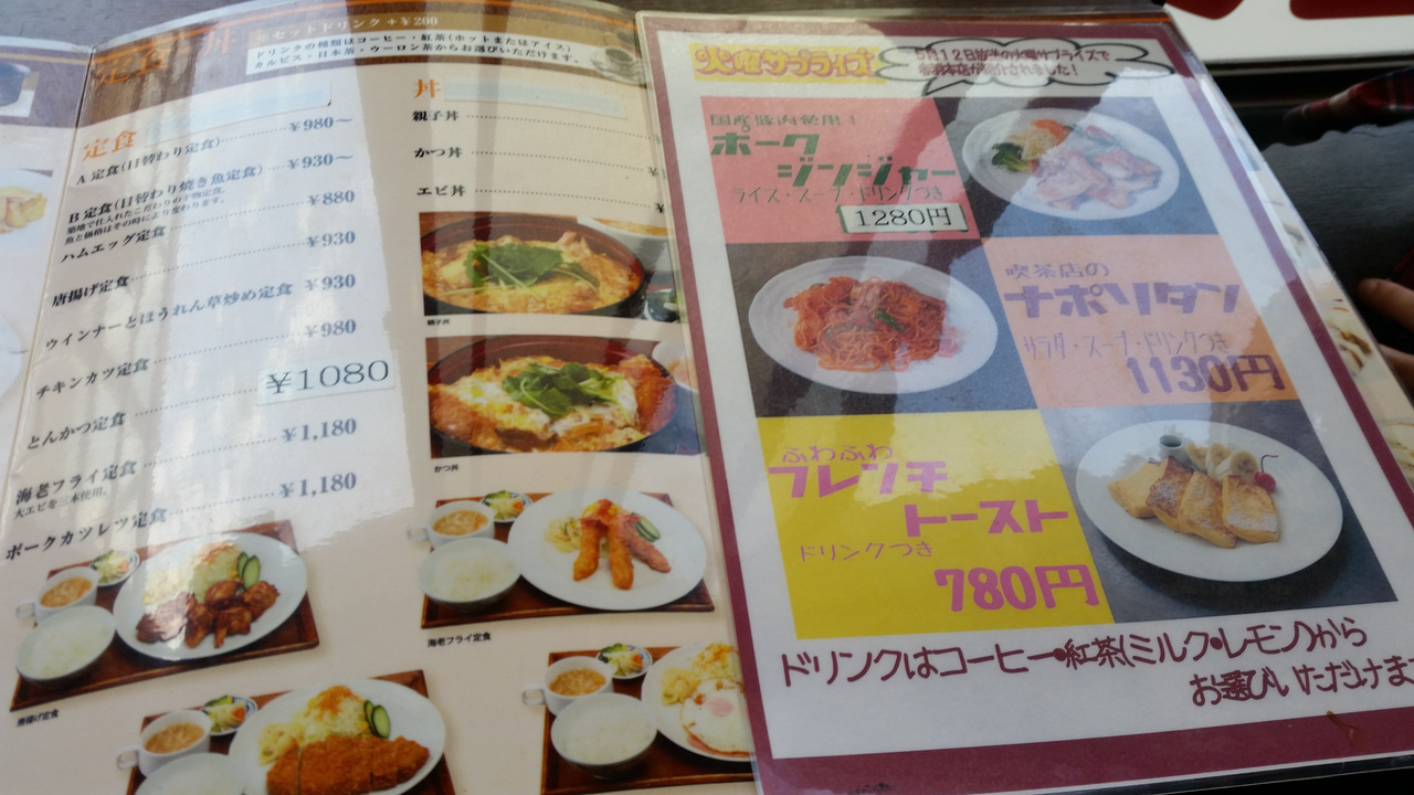 ここはテレビでやっていて、凄く美味しそうなところだったんで早速出掛けて来ました♪(^_^)/お店は昔ながらの店構えで常連さんも沢山居ました♪(^_^)/その中にテレビで観て来た人が半分以上はいた感じでしたね~(^^;)(;^^)メニューはドリンクから食事まで沢山あり、今回は4つメイン頼んで、デザートにフレンチトースト頼みました♪(^_^)/このフレンチトーストはトロットロで歯が要らない感じで、新食感♪是非とも味わって欲しいですね♪(^_^)/メイン4つどれも美味しかったですが、ポークジンジャーが一番美味しかったです♪(^_^)/