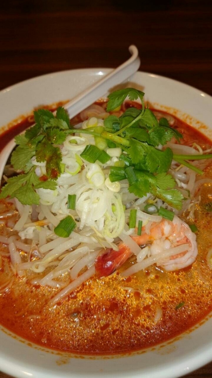 ここは数年前に出来てから通っているお店です♪(^-^ゞランチはセットメニューがあるし、夜はアラカルトでも楽しめますが、何を食べてよいか分からない時はコースもあるので助かります♪(^_^)/ここのお店のオススメはタイ料理の定番のトムヤムクン♪それのラーメンがあって出汁が美味しくて病み付きになります♪(*^^*)それに麺の太さが選べて、自分のオススメはセンミーです♪(^_^)/センミーは一番細い麺でスープと絡まってとっても美味しいんですよ~♪(*´∀`)♪メニューには書いてないんですが、替え玉もいつも貰ってます♪(^w^)食べる時は調味料を貰って、自分の好みの味にして食べるのが良いですよ~♪(^_^)/あと、ここのグリーンカレーは絶品なのです♪\(^o^)/ここの食べると他で食べたくなくなっちゃう位ハマリます♪(^w^)是非一度訪れてみて下さいね♪o(^o^)o