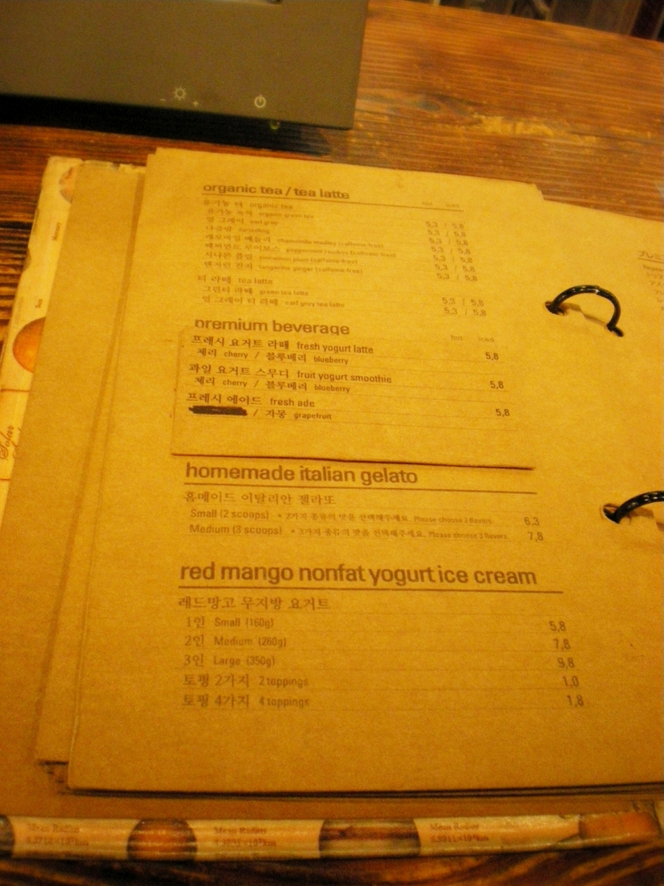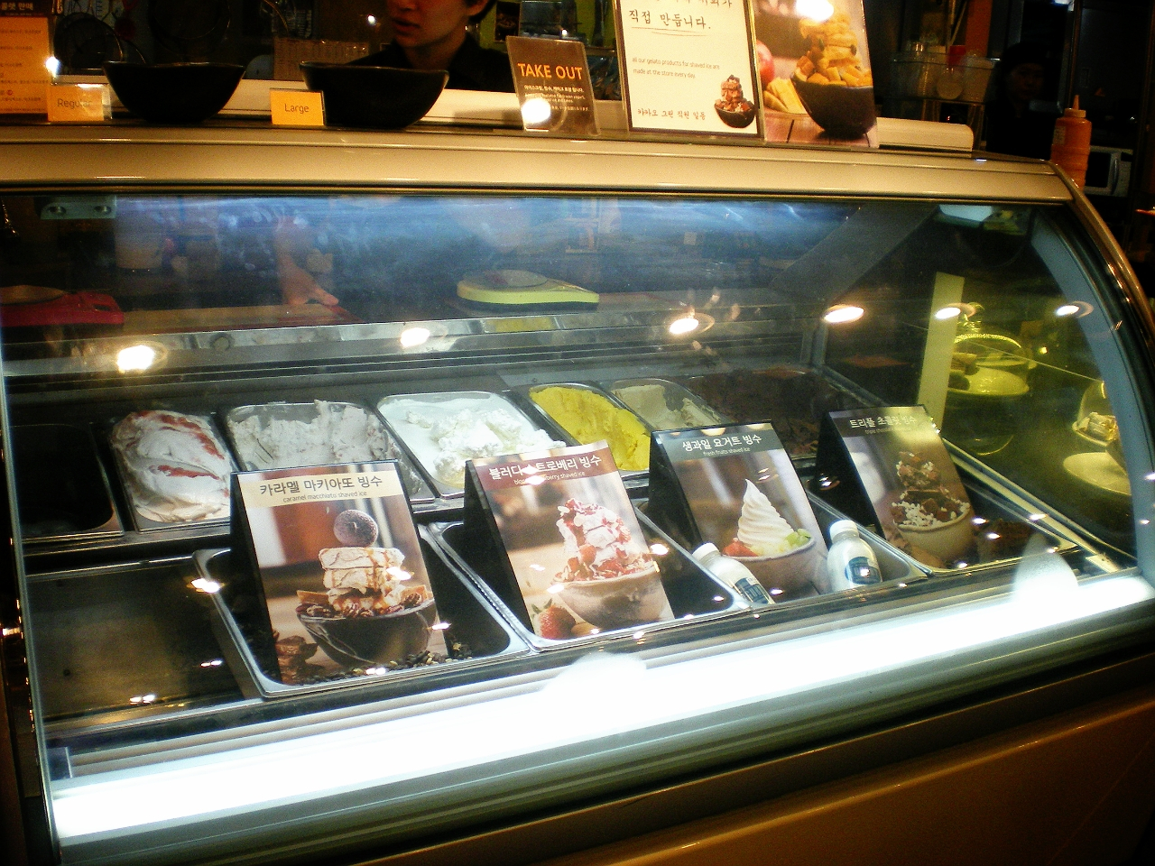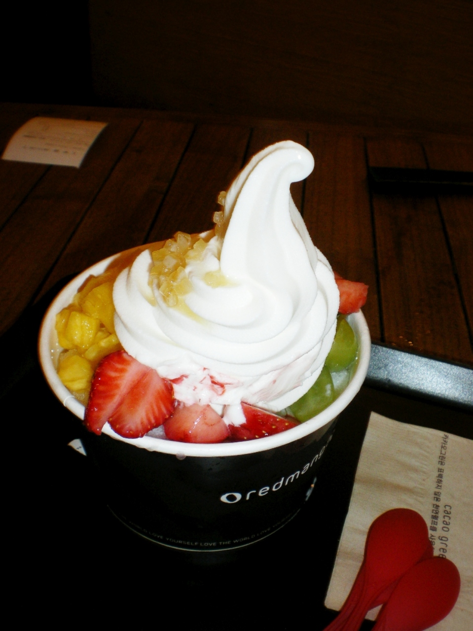 ここは今年日本に出来たお店の明洞店です♪(^_^)/しかも、ここはカカオグリーンという名前がついている!ここは日本語は通じないけど、注文はなんとなく身振り手振りでどうにか出来ました♪(^_^)/日本で食べたのとは違い、ミルク氷の上にフローズンヨーグルトが乗っていて、その上と周りにカットフルーツが散りばめられていて、レギュラーサイズなのにけっこうなボリュームでした♪(^_^)/味は美味しくて文句なし♪ただ日本語メニューがあればなぁ~って思いました~(^^;)(;^^)