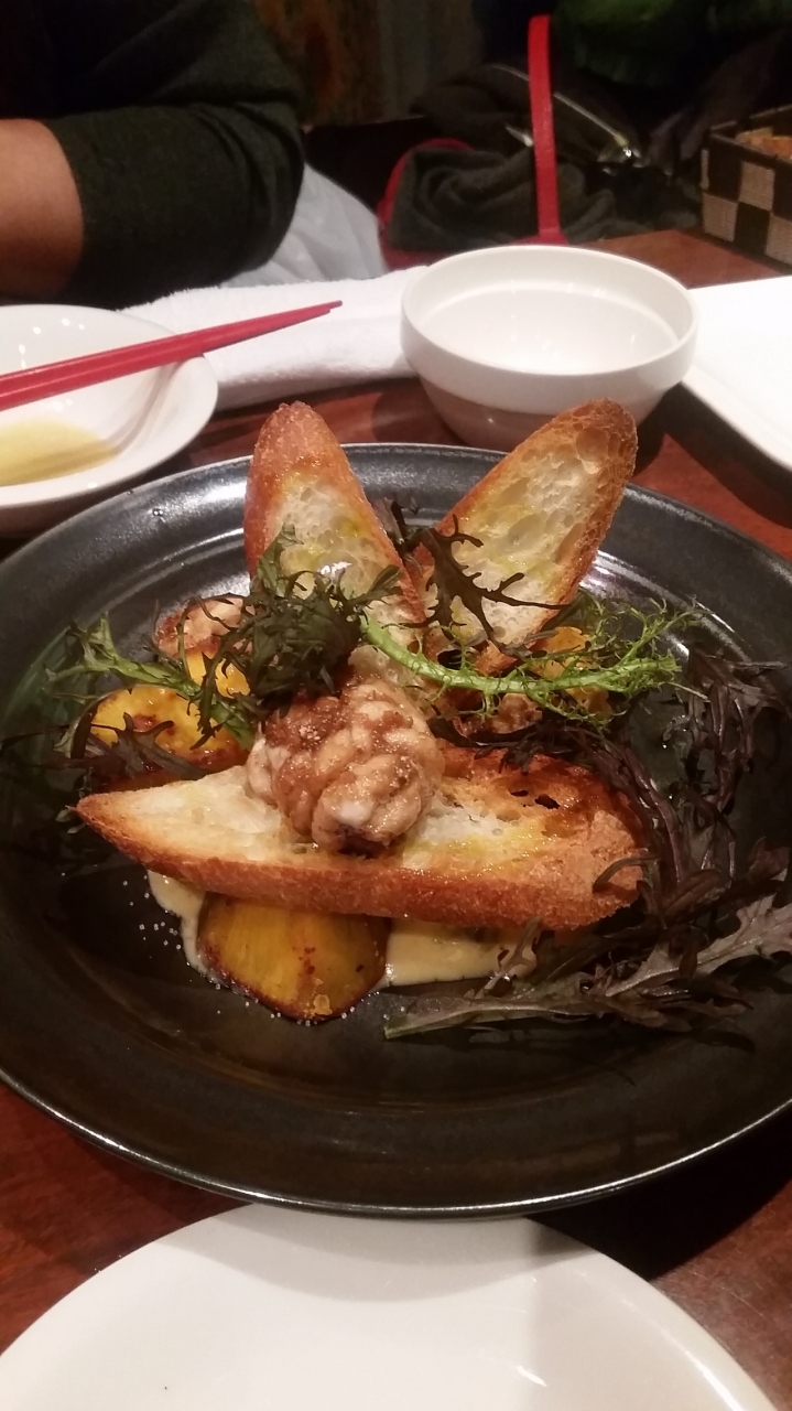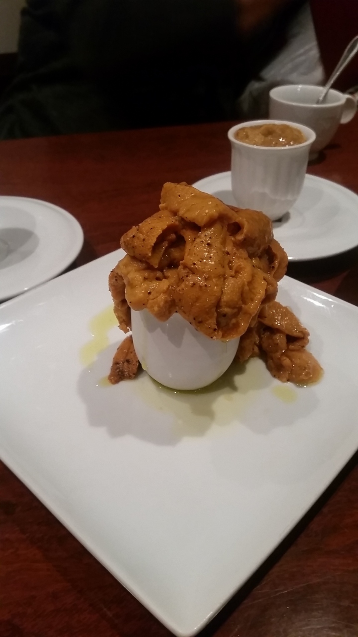 ここは新宿三丁目にある、隠れ家的なビストロです♪(^-^ゞ色々な料理がありますが、ここは『こぼれ?雲丹』というメニューがあり、それが一番の売りみたいです♪(^-^ゞ写真を2つ載せますが、その片方は前菜として頂いた物で、もう片方が注文したものです♪(^-^ゞ自分は雲丹を食べず嫌いでしたが、特に臭みや癖もなくて、普通に食べる事が出来ました♪人生初雲丹ですよ~(^^;)(;^^)