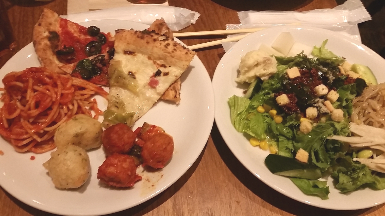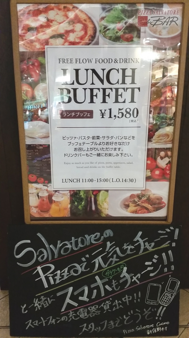 ここはピザで有名なサルバトーレの新宿野村ビル地下1階にあるお店で、ランチ時はビュッフェをやっています♪(^_^)/一時期はビュッフェを取り止めていたんですが、復活したとの事で行って来ました♪(^_^)/お店は新宿のサブナード店よりもかなり広く開放感があり、料理の種類もこちらの方が色々あるのでオススメですよ♪(^_^)/因みに人数が一人や二人の場合、優先的に席に案内してもらえますよ♪(^_^)/大人数の場合はなるべく早めに行かれた方が良いかと思います♪(^-^ゞ