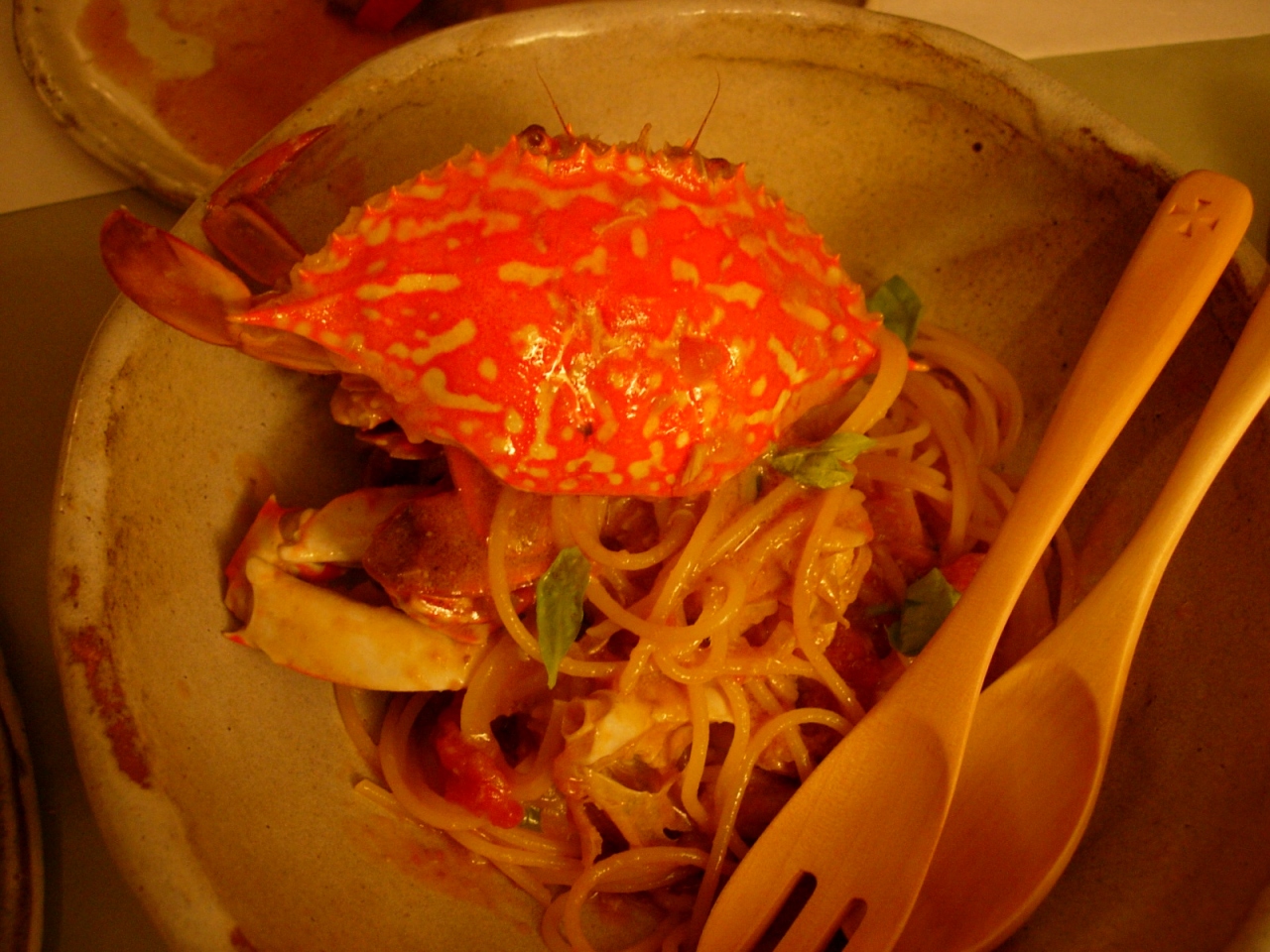 24席のこじんまりしたレストランですが、スペイン画家リャドの描く、色彩と光の美しい絵画が飾られていて、店の置くにはさりげなくパティオがあり、さらに癒してくれます。日替わりのカウンター料理(600円~)を選ぶのも楽しい♪ 写真のワタリガニのパスタは季節料理だけど、絶品です! 場所は中区加古町5-14 月曜と祝日はお休み。電話:082-247-5078
