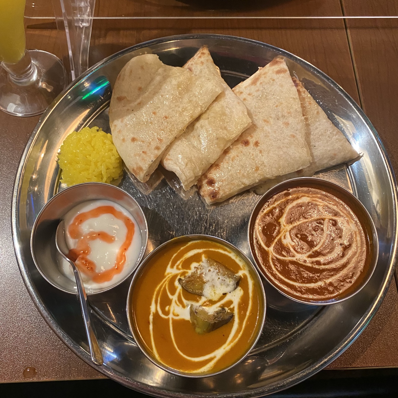 神田カレーグランプリに参加しているため訪問しました。カレー二種にラッシーもついてきました。ナンはチーズナンに変更しましたが、チーズたっぷりでおいしくいただけました。カレーも辛さで選べるので、控えめなのしおいしくいただけました。