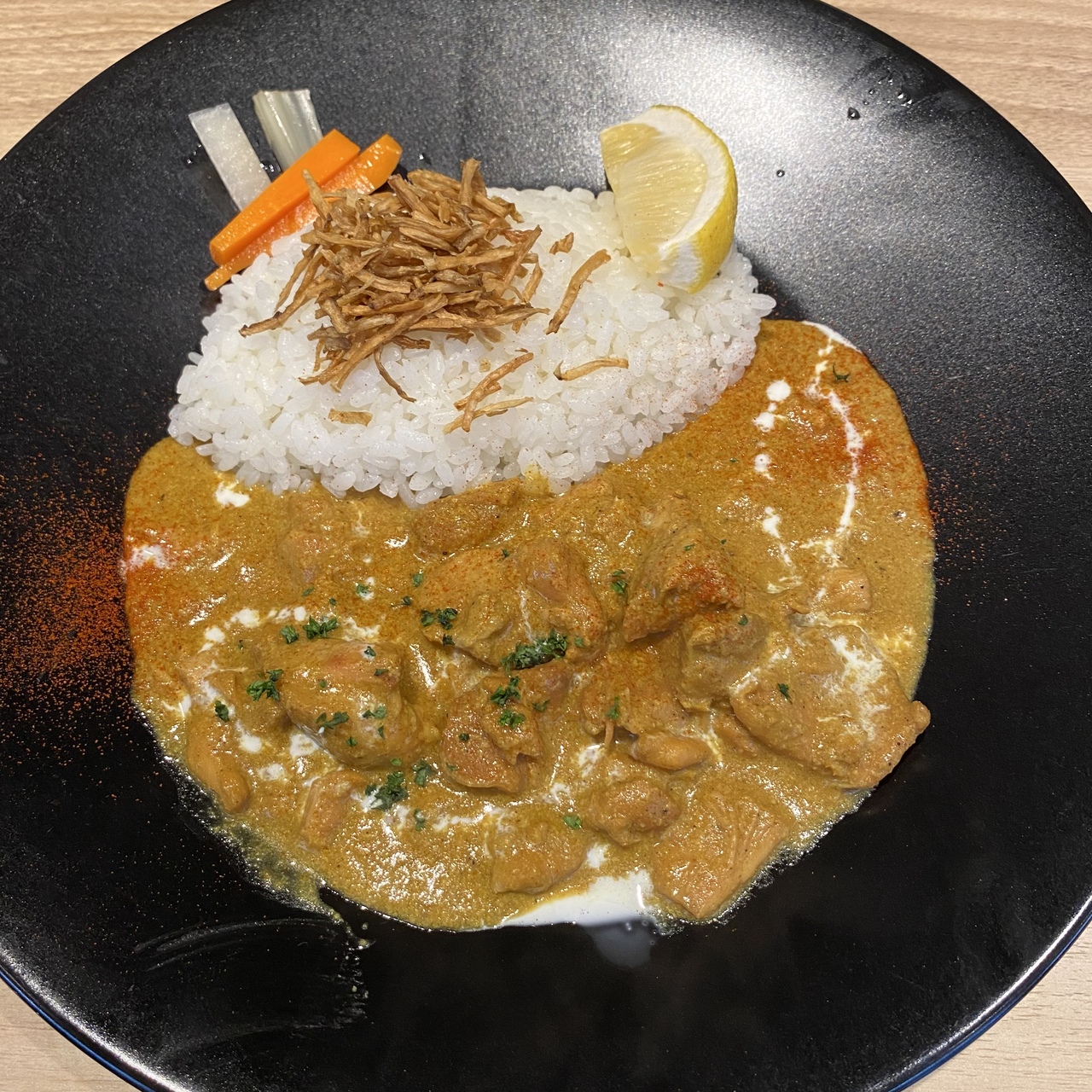 神田カレーグランプリに参加している店舗のため、ランチにて利用いたしました。カレーは一種類でバターチキンカレーでした。サラダとスープとドリンクがついてきてました。カレーはチキンが沢山入っていておいしかったです。