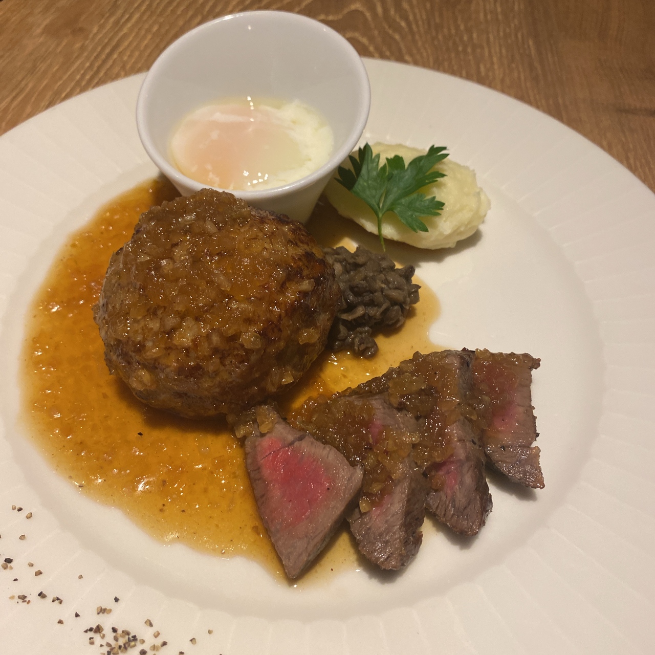 駅中にある店舗でランチにて利用しました。ハンバーグと薫格肉をいただきました。ハンバーグのソースは選ぶことができました。お肉は柔らかくて、おいしくいただくことができました。ゆっくり食事ができてよかったです。