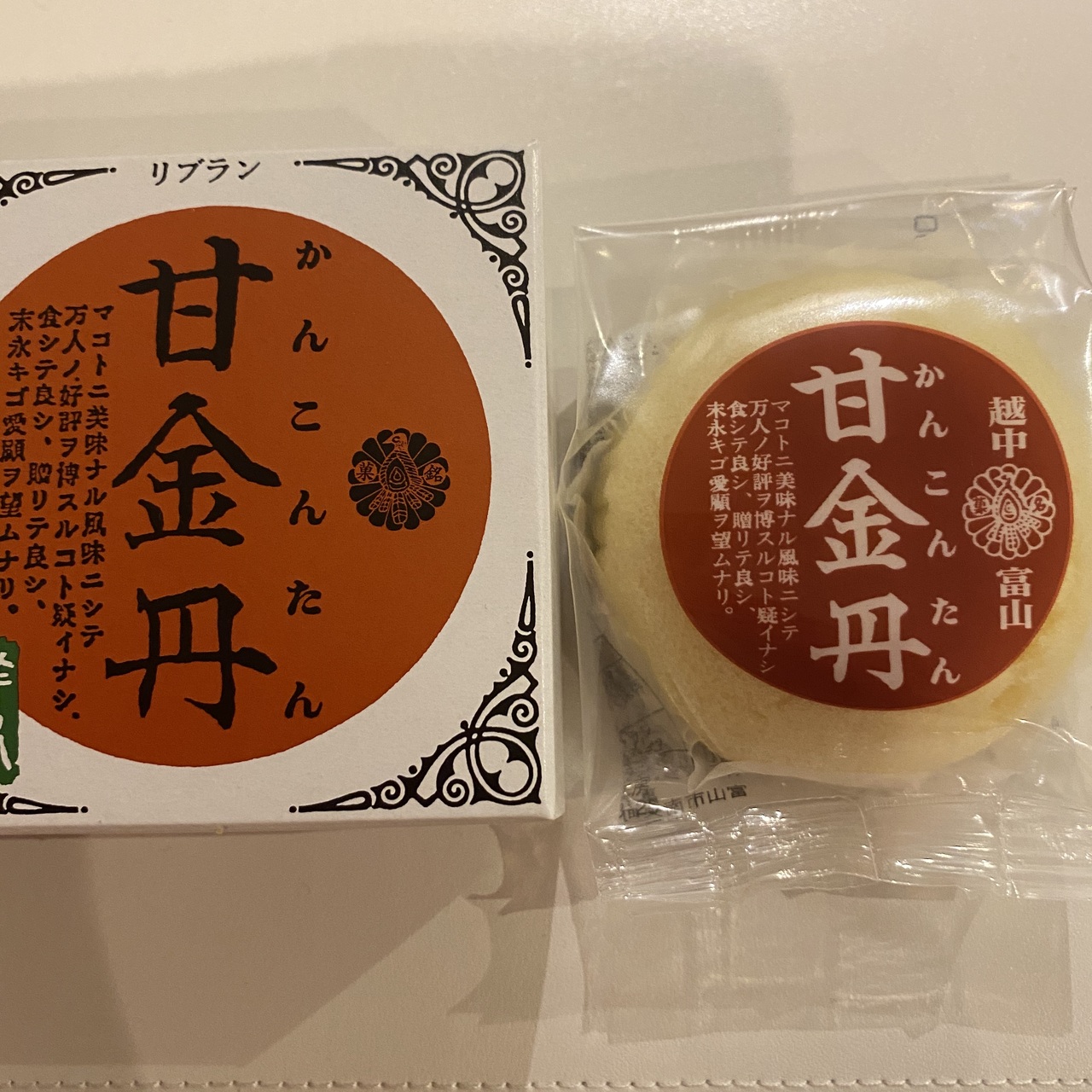 富山の旅行の時に、何度かお店を見ました。富山土産では定番とも言えるお店で、和菓子も洋菓子も取り扱っておりました。今回は、甘金丹を購入しましたが、ふわふわのスポンジの中にカスタードクリームが入っており、おいしくいただけました。