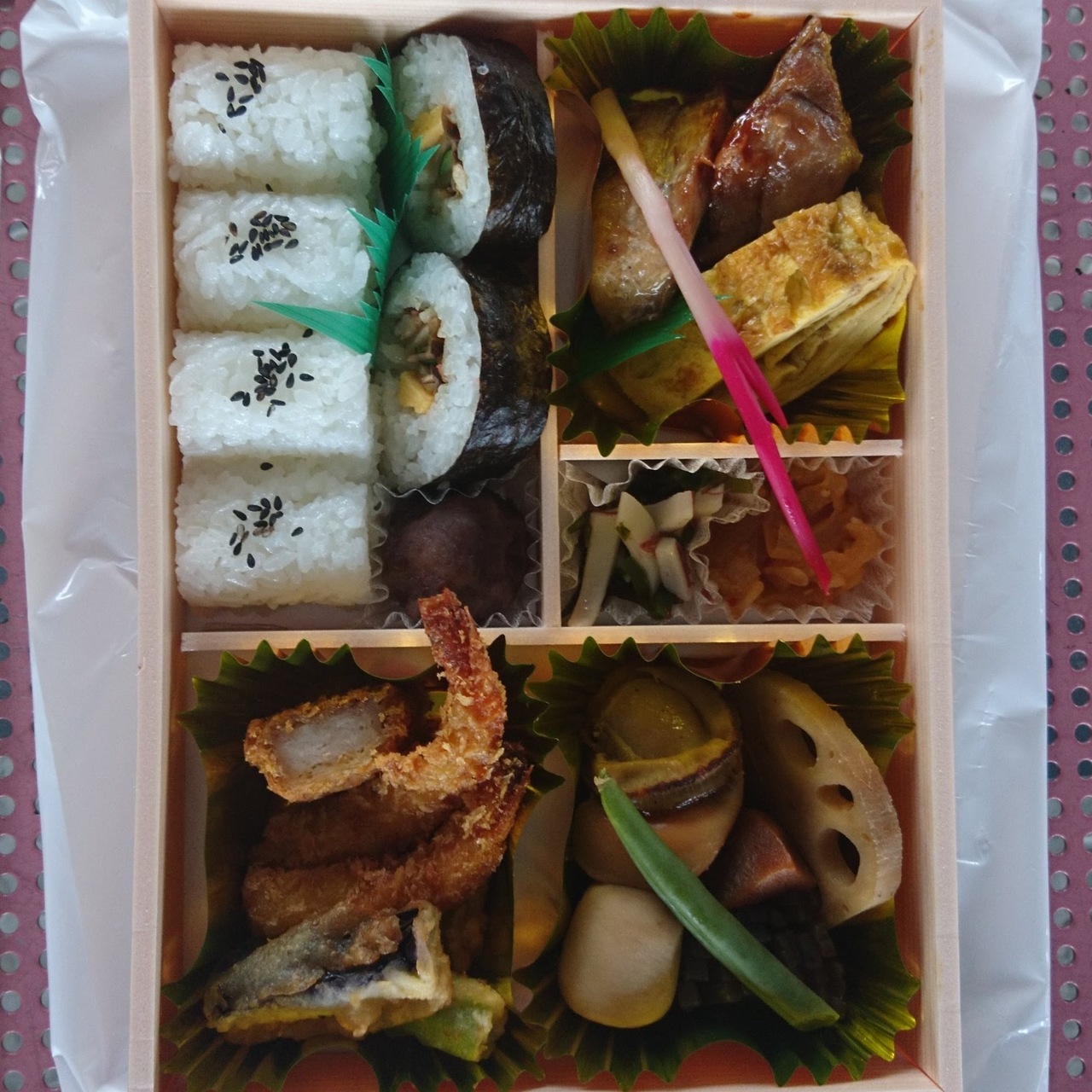 今回は、お弁当を購入いたしました。総菜を少量で種類は多く楽しめたのでよかったです。全体的なボリュームもちょうどよく男性でも満足できると思います。魚を中心として総菜も揃っているので自宅にはこちらの方がよさそうです。