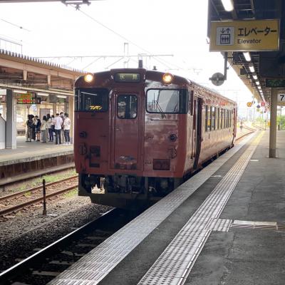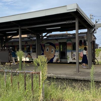 ハットリくんのキャラクターのラッピング列車です。タイミングがよく見る事ができました。電車自体は2輛編成でしたが、ラッピングされているのは1輛だけでした。ハットリくん自体には興味は無いですが、載ってみるとテンションがあがります。