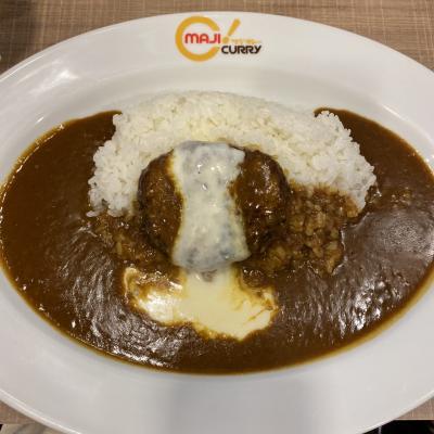 グランプリカレーを頂きました。自分でチーズをかけていただきます。カレーの辛さはどちらかという辛めだと思いますが、福神漬け(神福漬け)とともにおいしく頂けました。ハンバーグものっておりボリュームありました。