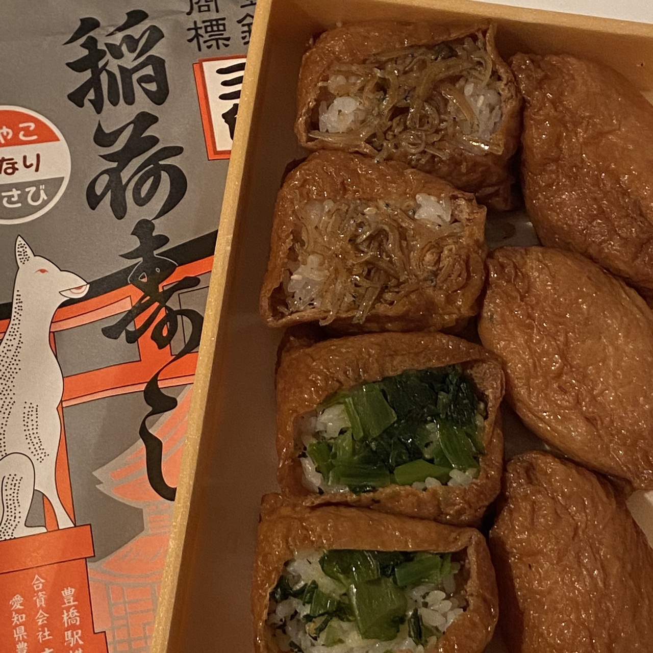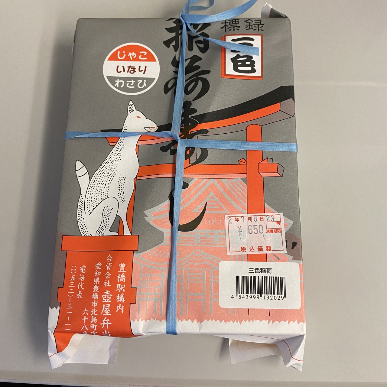 豊橋駅の駅弁として有名なようです。今回は、3色稲荷と購入いたしました。稲荷の甘さと、わさびの辛さの相性もよく、3種類にして正解でした。在来線、新幹線のどにらでも購入することができるので、ホテルのお夜食にもおすすめです。