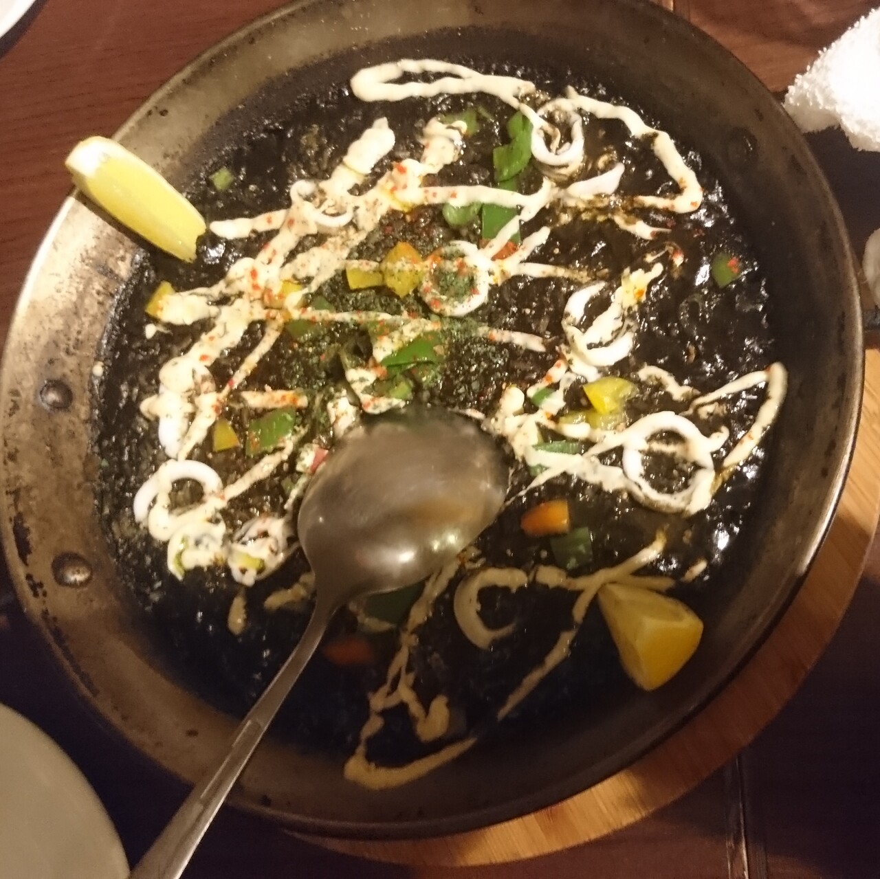 二軒めで利用いたしました。飲み物はワインのボトルにしました。時間がかかるパエリアは先に頼みました。イカスミのうえにマヨネーズがかかっており、美味しかったです。店内はカウンター席とテーブル席がありました。
