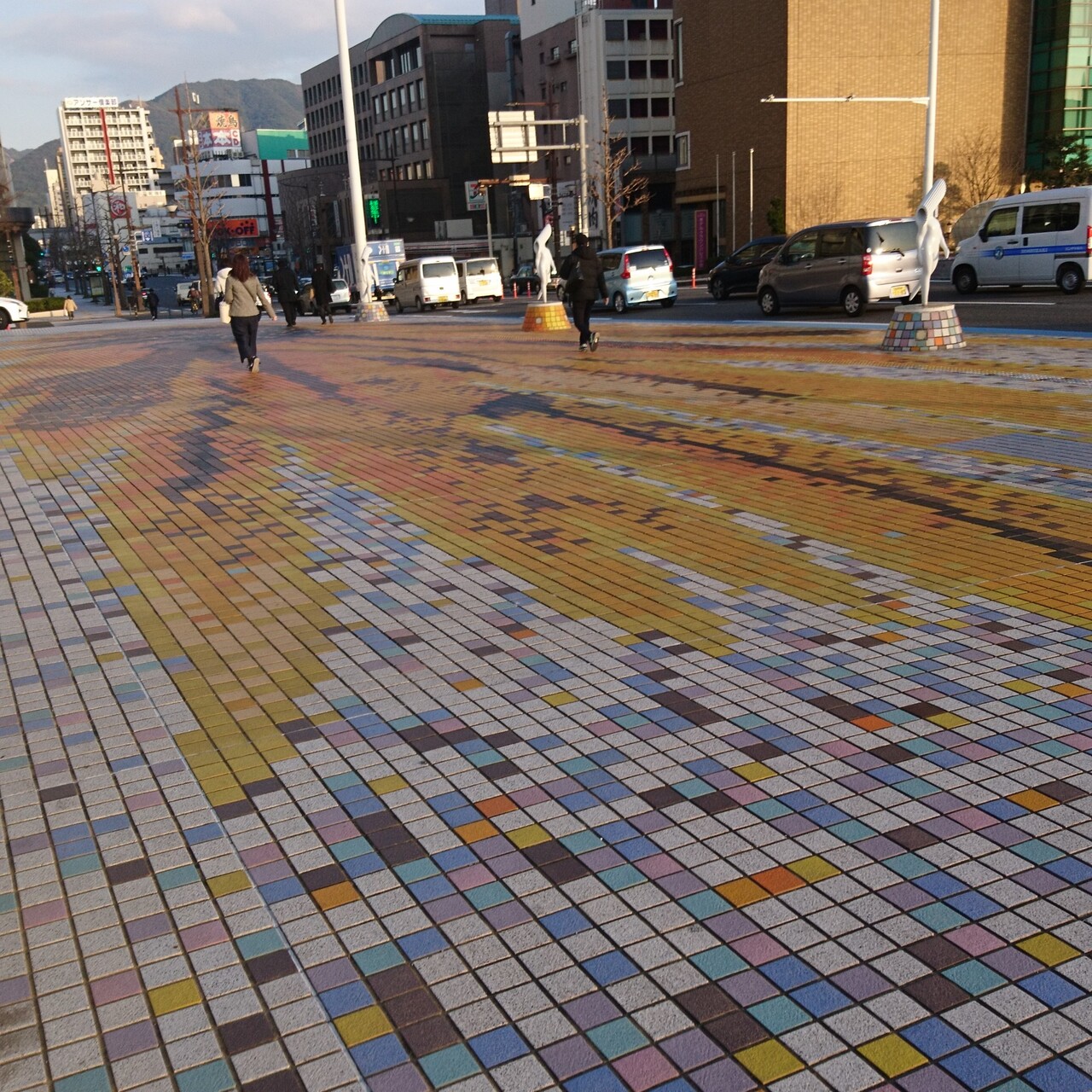 小倉城の観光のあと、近隣を散策しました。そのときにこちらの橋を渡りました。道路に面してモニュメントがあり、道路も太陽の柄なのか黄色になっておりました。橋のかたちも面白い形をしておりましたが、観光客は少なかったです。