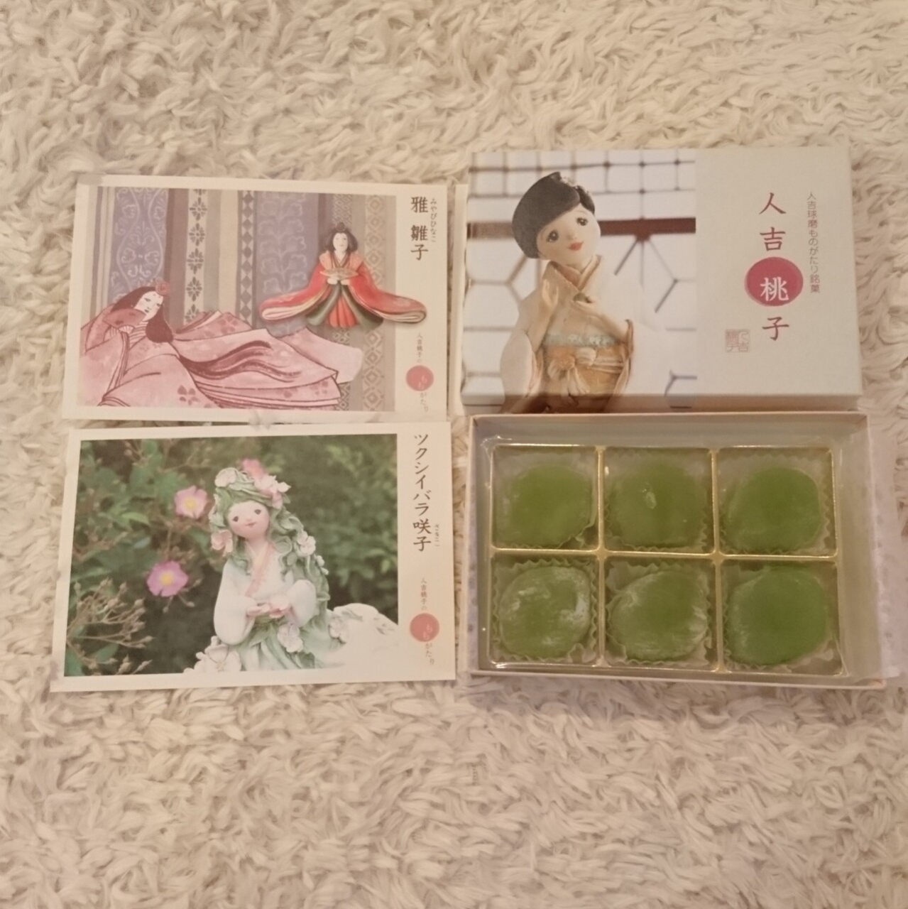 陣太鼓で有名なお店ですが、イートインコーナーがあり、ギャラリーも楽しめます。こちらの店舗限定で人吉桃子というアイテムが販売されております。幼桃を使っており、さわやかな甘さで美味しかったです。絵はがきもいただきました。
