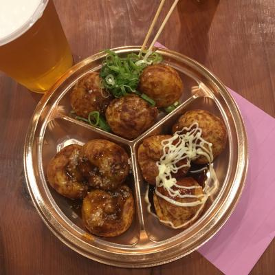 大阪といえばたこ焼きということで、帰京前にいただきました。盛り合わせがあったので、ビールとともにいただきました。ソースと醤油とカレーの三種でした。ソースは鰹節と青のりがなくて残念でしたが、美味しくいただけました。