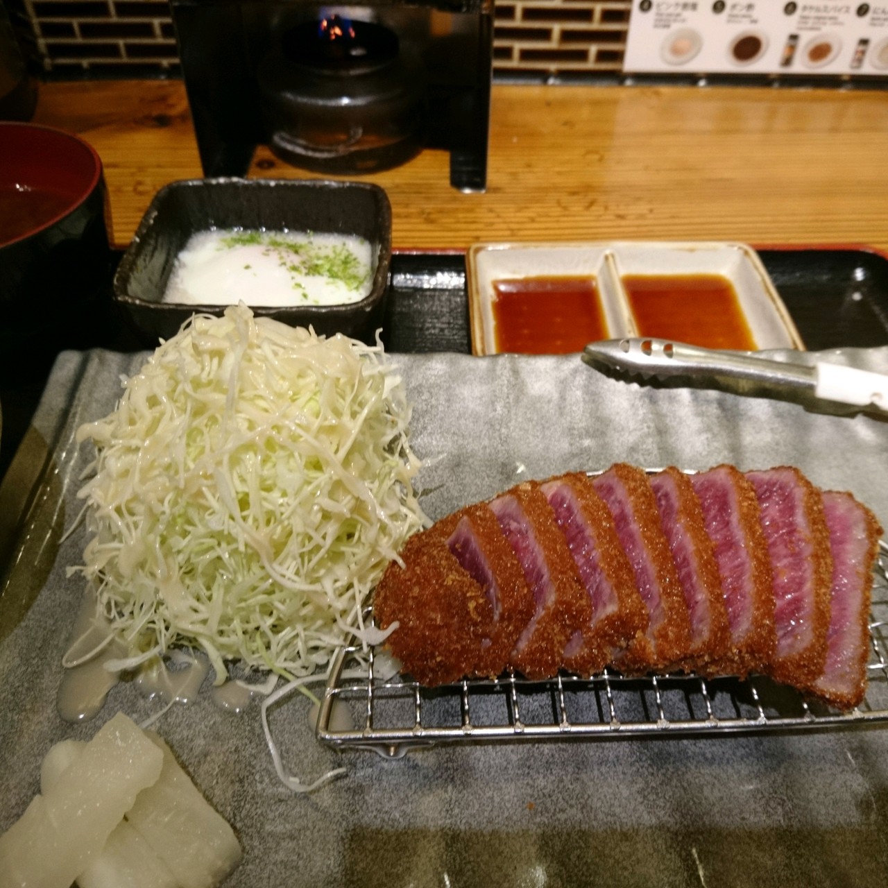 店内はカウンター席のみで食券方式なので、1人でも入りやすいお店だと思います。今回は牛カツ温玉とろろ定食にしました。牛カツは自分で、焼いてから頂きます。調味料なども言えば出てくるようですが、机上にあるものだけでも問題なくいただけます。