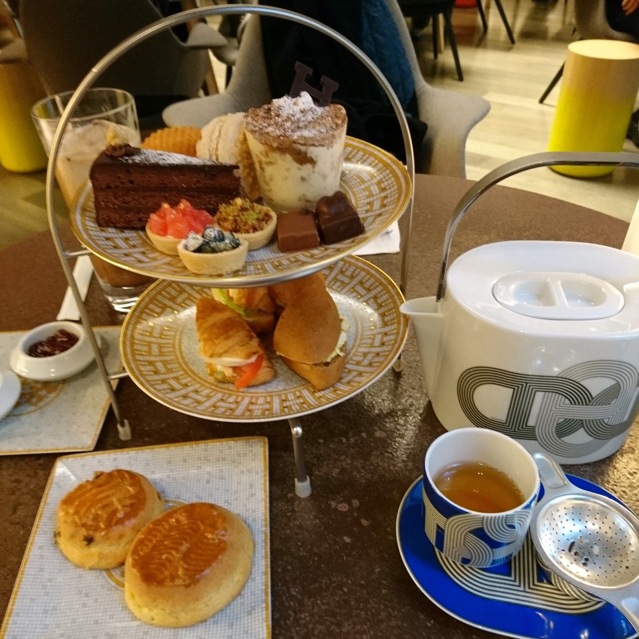 ショップの地下に店舗があります。今回は、アフタヌーンティにて利用いたしました。2人用になっており、スイーツが二人でシェアするようになっております。どれも、Hの形のチョコレートがのっているだけでテンションがあがりました。