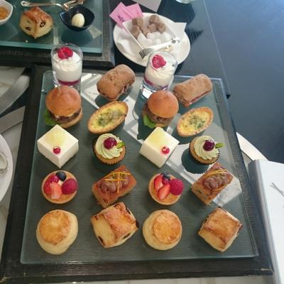 宿泊するときにもらえるコンラッドベア付きプランにて予約しました。間際の予約だったので、残念ながら窓側の席はとれませんでした。食事は硝子の皿に並べられておりました。食前酒のあとは、いろいろな種類のティーが楽しめました。