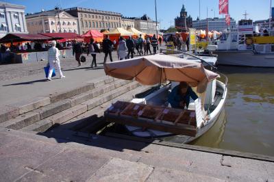 ガイドブックに載っていた船で魚を売っている人もいました。屋台もたくさんでており、フードメニューや雑貨などさまざまでした。サーモンはとても大きい状態で焼かれていて、味付けも複数ありました。どれもおいしそうでした。