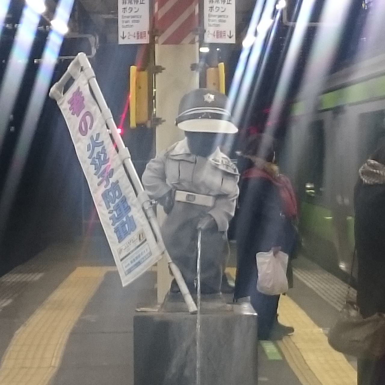 浜松町駅ホームの端にあり、説明書きがされた看板も設置されております。初めは、あることすら気がつきませんでしたが、何度か観てると、定期的に洋服が変わったりと楽しませてくれます。現在は春の火災予防になっております。