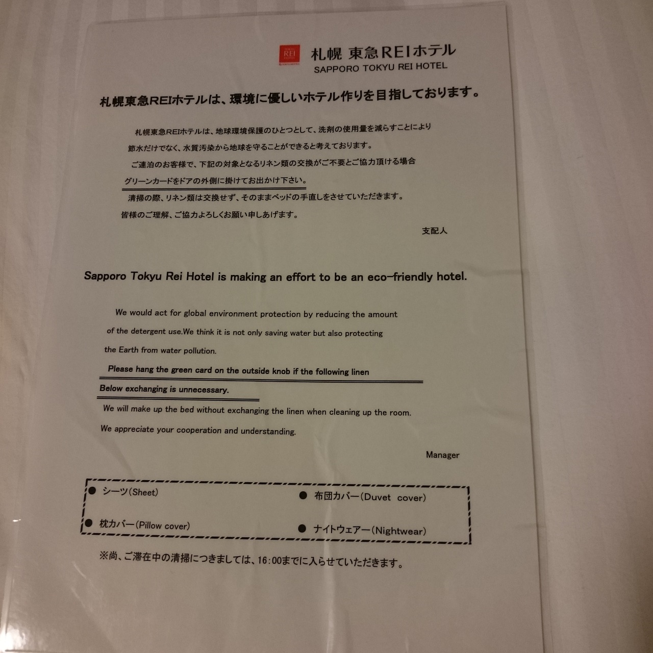 すすきの立地しているので食事は困りません。朝食もビジネスホテルとして、種類が多く、食べ過ぎてしまいます。室内に置いても、この価格において大満足でした。エコへの取り組みとして清掃やアメニティを断ると、クオカードがもらえます。
