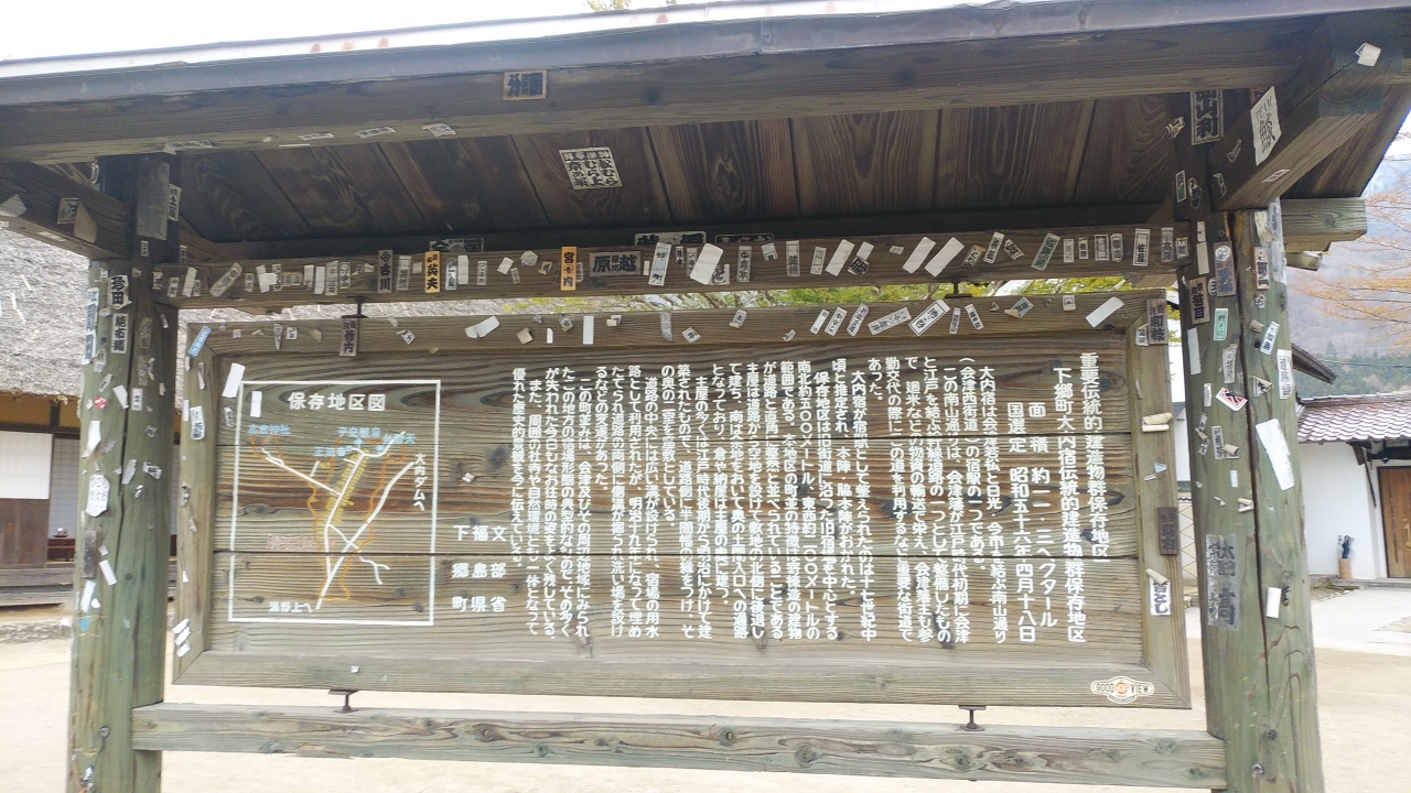 テレビで何回も大内宿を放映したのがきっかけで旅行したいと思って、東北旅行計画に入れたのですが、大内宿が混雑する前に観光しようと前日芦ノ牧温泉に1泊、今日は大内宿、鶴ヶ城、飯盛山等を観光して東山温泉庄助の宿と2泊したけれど、大内宿って朝お店の人が通勤している様子だったし、蕎麦屋とお土産屋ばかりで見所は少ないし、蕎麦も食べたかったのに観光して帰るまで2時間弱いましたが殆どが準備中。10時半頃帰りましたが、そろ頃大勢の団体客の出会いました。同じ雰囲気の宿場では岐阜県の白川郷の方がよっぽど良かったです。