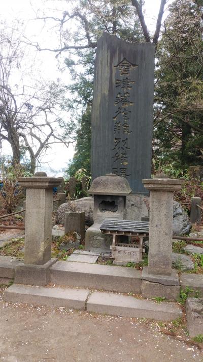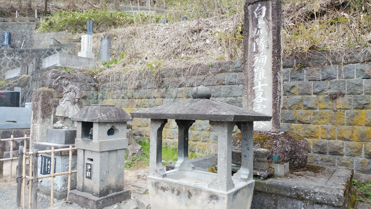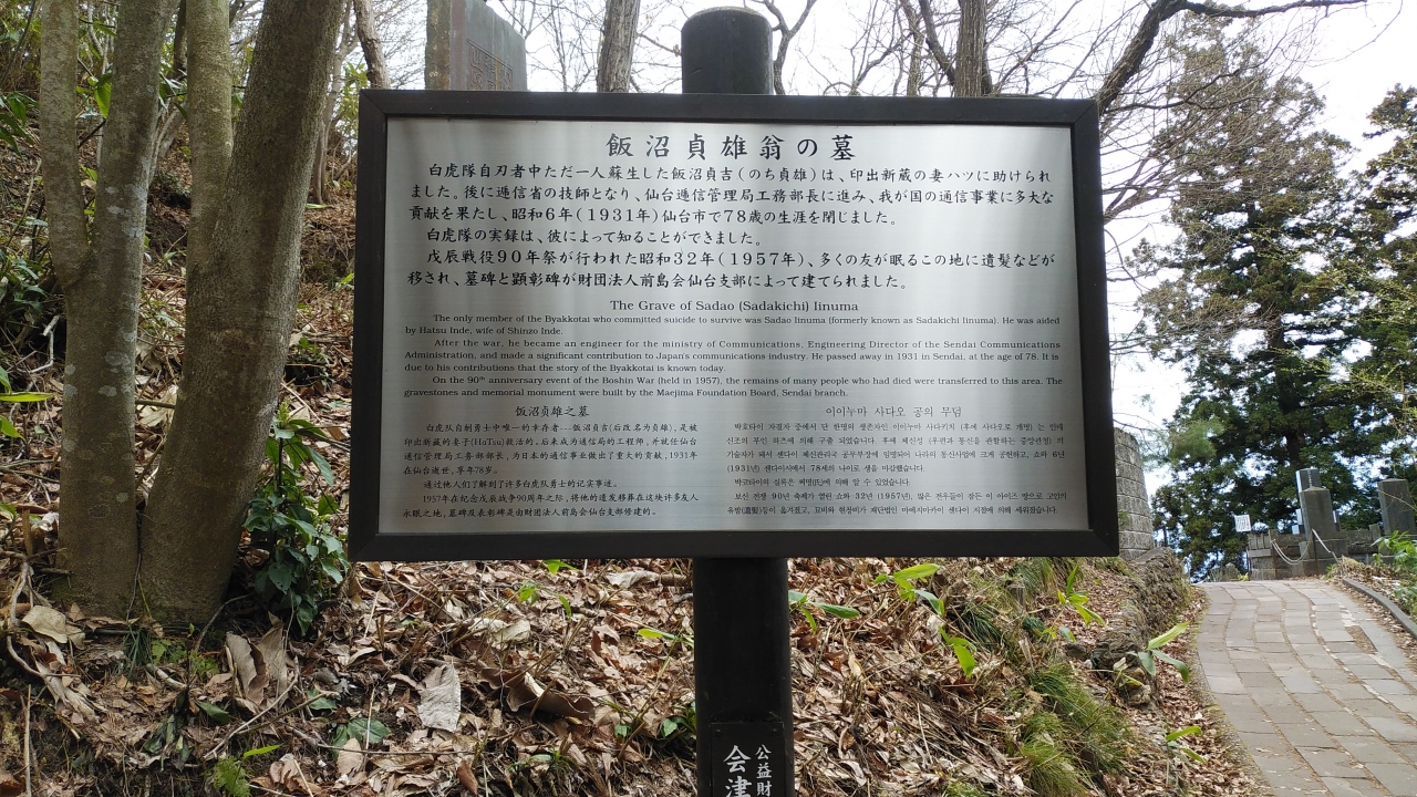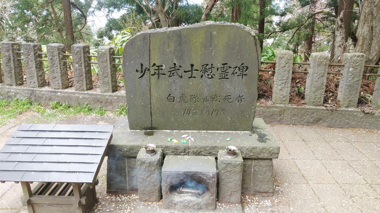 飯盛山頂上にありました。戊辰戦争で齢16~17の少年たちによって編成された白虎隊は、戸ノ口原合戦から退却し辿り着いた飯盛山で、鶴ヶ城の天守を覆い隠す激しい炎と濛々たる黒煙を目にした時、隊士の間では城に戻り戦うか、敵陣に斬り込み一人でも多く道連れにするか、激論が交わさた結果、彼らが選んだのは自刃。捕らえられて生き恥をさらすより潔く死を選ぶ、という結論だった。ある者は腹を割き、ある者は喉に刃を突き立てる、凄惨たる光景―。新政府は彼らの遺骸に手をつける事を許さなかったが、3ヶ月後、近くの村人・吉田伊惣治らによって付近の妙国寺に密かに仮埋葬された。改葬が許されたのは明治2年。その時作られた墓は拡張され、大正15年に今の形となったそうです。当時の悲しき物語を見る事が出来て良かったです。