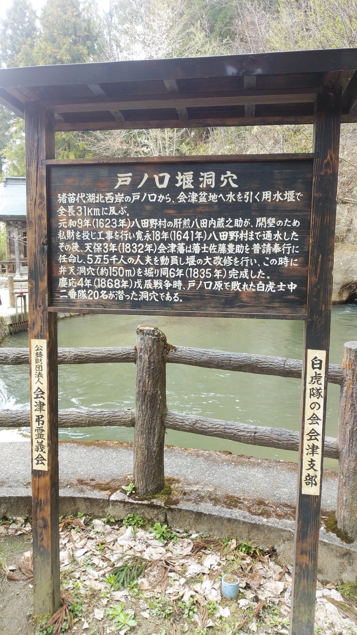 飯盛山のさざえ堂を過ぎると神社と洞窟がありました。この洞窟は猪苗代湖西岸の戸ノ口から会津盆地に水を引く用水堰で、全長31Kあるそうですが、戊辰戦争の猪苗代湖畔・戸ノ口原の戦いで破れた白虎隊士ら二十名は、鶴ヶ城を目指して長さ約150mの洞穴を潜り命からがら、飯盛山の中腹へ到着し、主君がいる鶴ヶ城の安否を確かめんとする一心で、冷たく流れの速い洞穴の中を足を取られながらも進んでいって、飯盛山の中腹に辿り着いた末城下の黒煙を目にして自刃したと言われているそうです。こんな小さい洞穴を150Mも潜って進まなければならない状況を想像すると悲しくなりました。