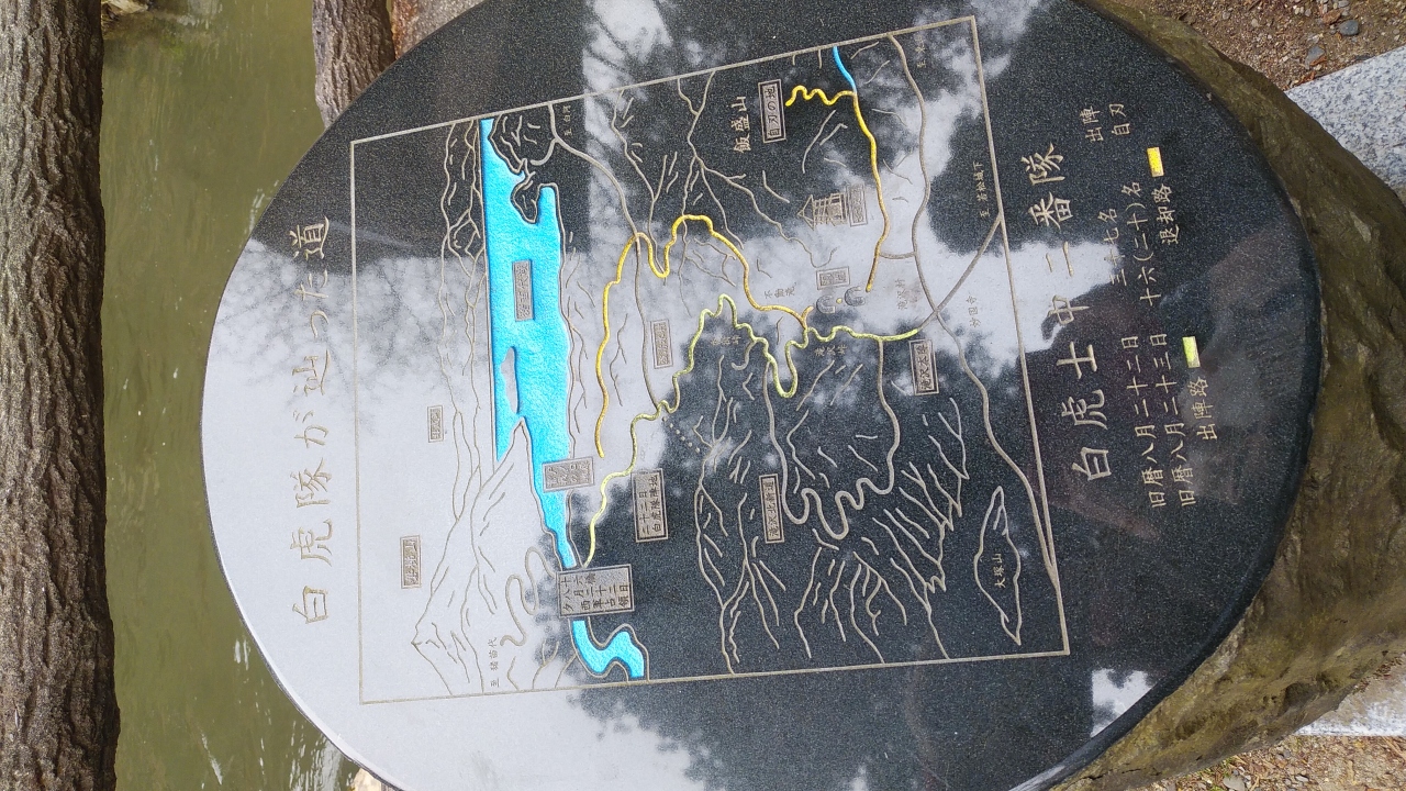 飯盛山頂上の白虎隊十九士の墓を真っすぐ進むとイタリアとドイツ記念碑の間にある階段を降りるとあります。戊辰戦争で圧倒的な勢いで迫る新政府軍に押され、敗走し負傷者を抱えながら飯盛山に落ち延びた時に鶴ヶ城をみると、天守を覆い隠す激しい炎と濛々たる黒煙を上げ武家屋敷の大火災を目にした隊士らは、戻って生き恥を晒(さら)すよりは、潔く死を選んだ。と言う有名な話の地です。でもただ一人生還した隊士がいたそうです。ここからの景色は良かったです。でも階段は急なので年配者は注意がひつようです。
