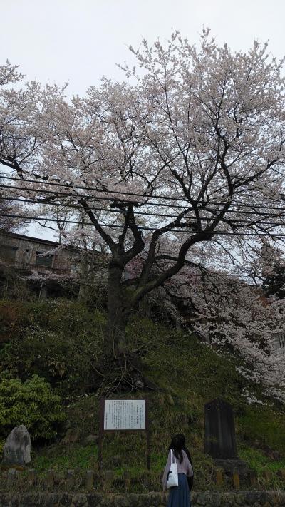飯盛山を観光して下山すると白虎隊記念館手前の山斜面に大きな桜が満開でした。立て看板によると、高さ13m、周囲5.5m、樹齢300年のエドヒガンザクラです。会津五桜の石部桜とともに会津二老樹と呼ばれています。寛永3年(1626年)、蒲生忠郷公在城の頃、若松城下の掘江町にいたいつき太夫と云う名妓が、花見のおり、この辺で兇徒のために殺害された。