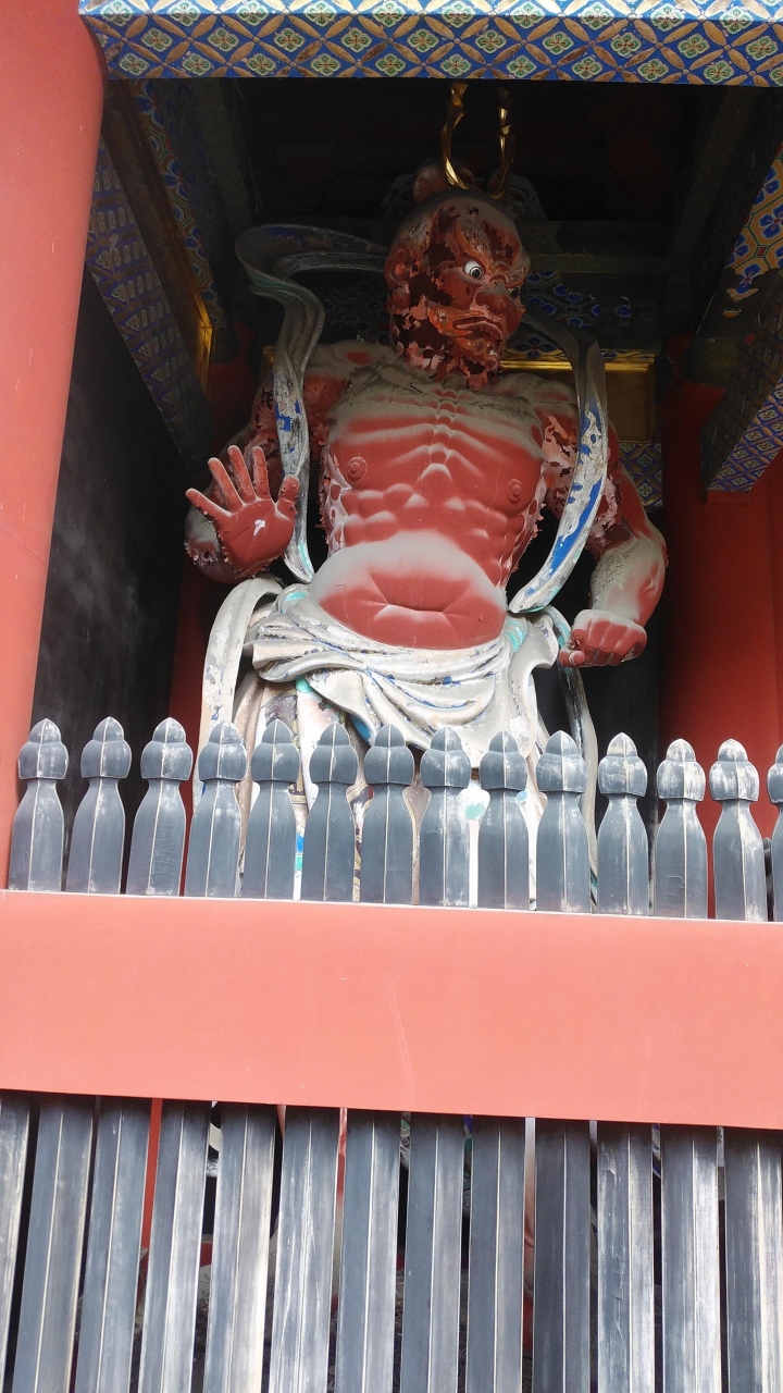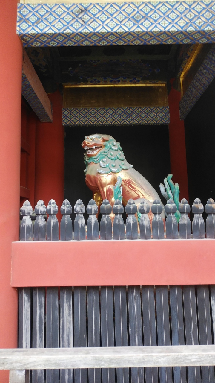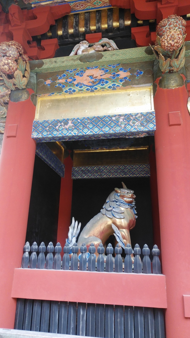 石鳥居を潜り五重塔と御仮殿を見学して表門という第二の門は切妻造八脚門で、本橋や4本以外に後ろにも4本あり合計8本柱があるので八脚門と言う種類で日光には多くある建築様式です。表側は仁王像で裏側は唐獅子像で共に「阿形」と「吽形」のセットになっていました。高野山の四天王像の方が綺麗でしたが、東照宮の仁王像は大きな像で綺麗な朱色の塗装です。私も各地の門と四天王像を見ましたが、狛犬像が門にあった記憶はなく、本来狛犬は「高麗犬」「護摩犬」で朝鮮からきたもので、神社の神様を守護して魔除けを担ったものですが、日光山には神仏習合の名残が残っているのを見ました。また、表門の日本の柱の上に「獏の木鼻」があり、悪夢を食べるといいますが、同時に金属も食べるので武器をもって入れない平和を象徴しているのかも知れません。