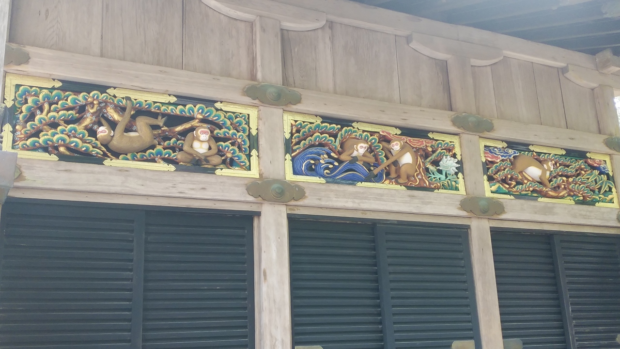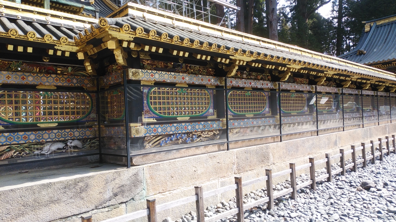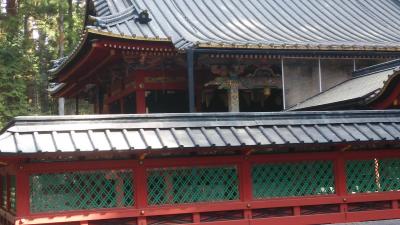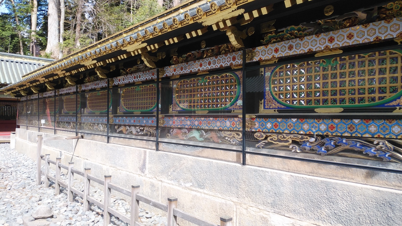 三神舎の対面にあり神馬と称される神様に奉仕する馬が生活する場所で、現在の厩舎です。この神厩舎は家光が東照宮を再建した折に造営され、家康の愛馬が家康の永眠を守る為の御奉仕場所としてつくられたそうです。輪王寺にも同じような伐採した木をそのまま使用して塗装がされていない素木で作られた建物がありました。この三厩舎の梁の間に16匹の猿が彫られていて人の一生を表現していて有名な彫刻ですが、10数年前に来たとはよりも色鮮やかになっていましたが、猿の彫刻としては昔のほうが猿らしく、現在は孫悟空の猿みたいでした。