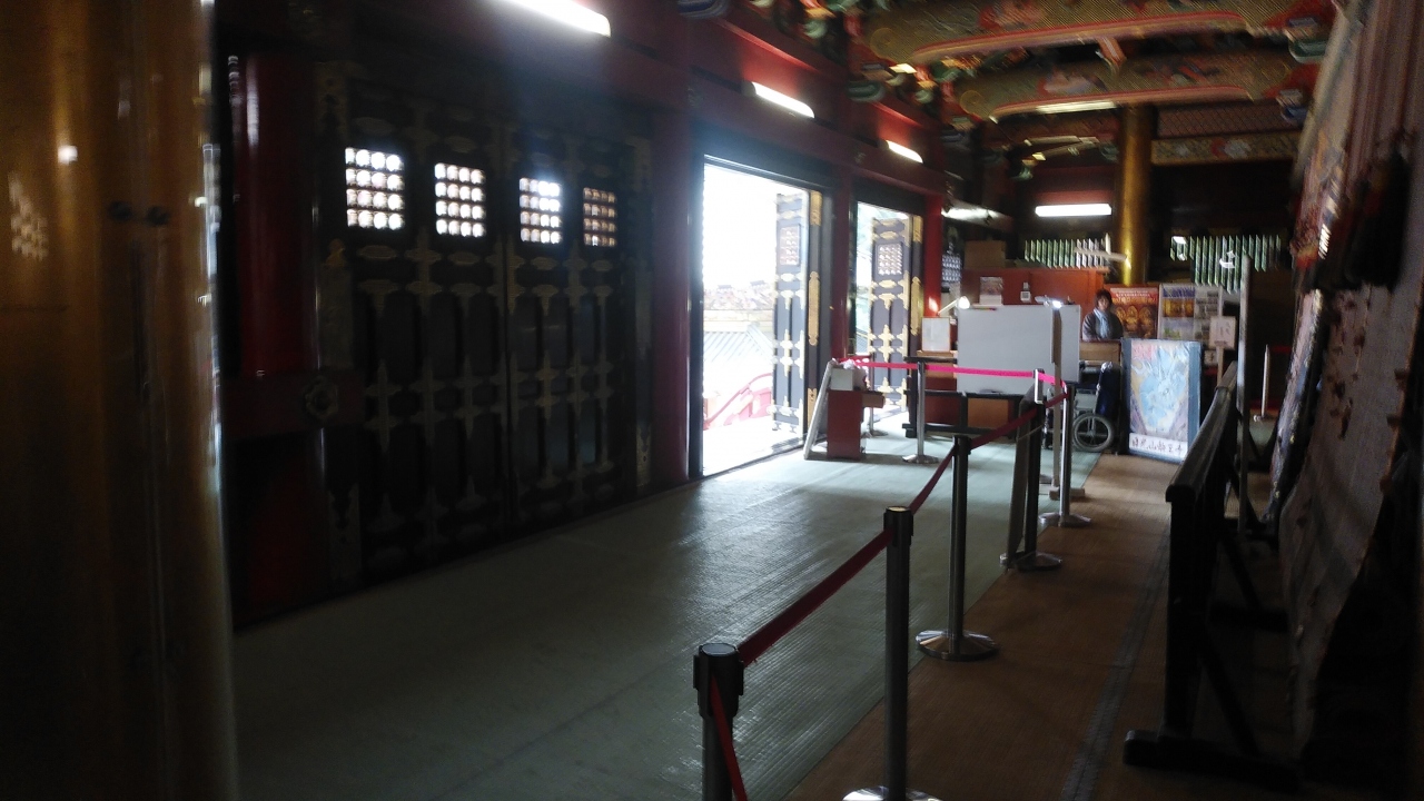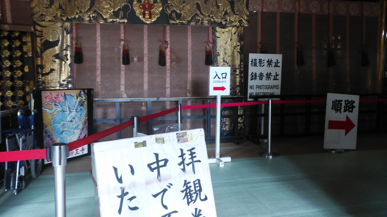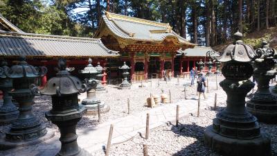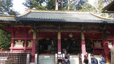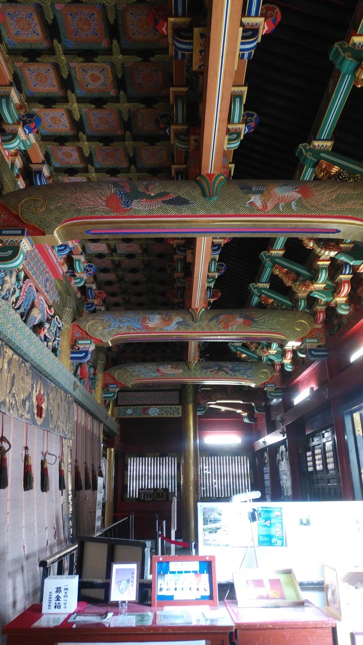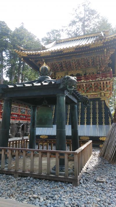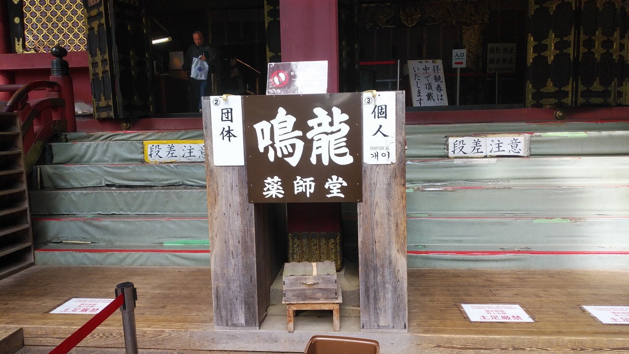 家康の姿を具現化させた本地仏「薬師瑠璃光如来」を本尊とし、祭祀していることから「薬師堂」及び「本地堂」と呼ばれ大きな建物で極彩色の華麗な外観でした。しかし、ここにも神仏混合の名残があり、薬師堂の所管は輪王寺で、神社である東照宮内にありながら寺院というややこし建物が日光には多くありました。薬師堂内には檜板34枚で造られた鏡天井に「狩野永真安信」によって描かれた有名で巨大な「鳴き龍」の絵があり、竜の顔の真下で拍子を打つと天井の竜の画と床が共鳴して甲高い音(龍の鳴き声?と言われていました)が聞こえました。でも拍子を打つ場所が違うと音が共鳴しませんでした。堂内は撮影禁止でお坊さんが案内して鳴き龍についても詳しく説明があるので解りやすかったです
