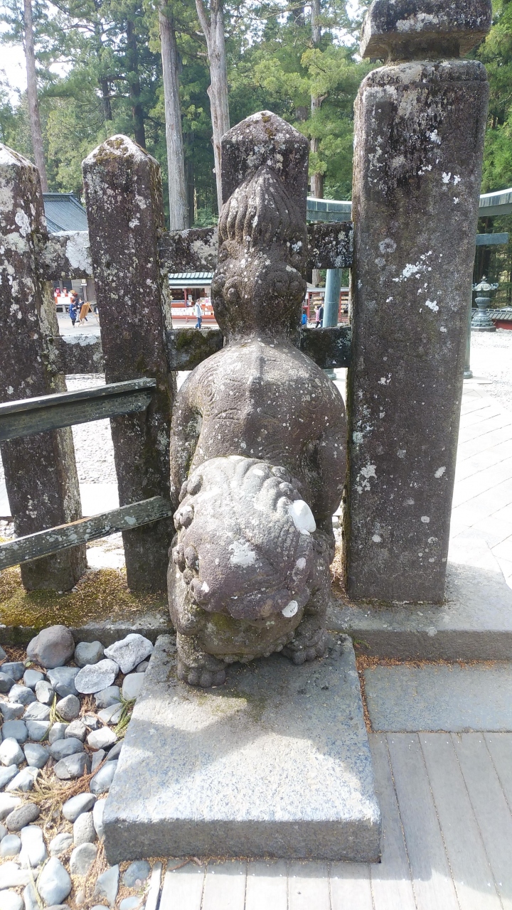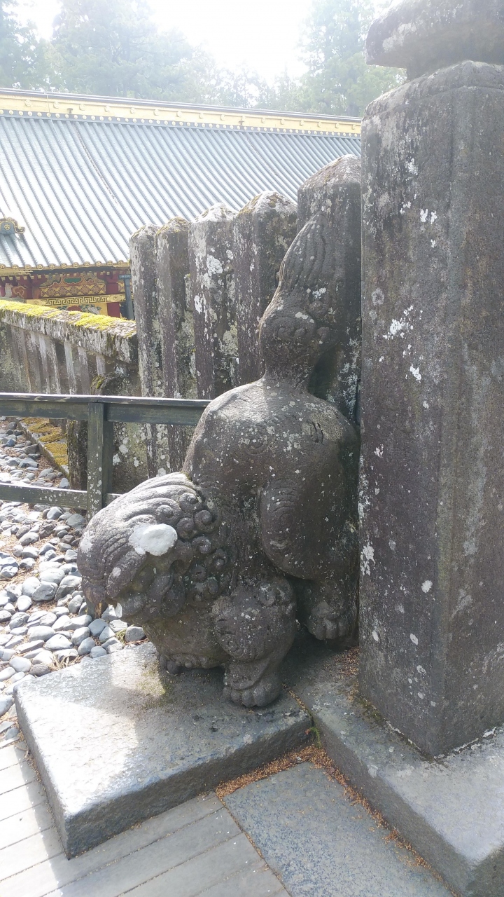 陽明門の右手前の石柵の裏に石柵と引っ付いているような石の彫刻が左右に1体ずつありました。何とも不思議な石で逆さになっていて名前のとおり「石柵を飛び越えているのか」「石柵にくっついて支えているのか」わかりませんでした。