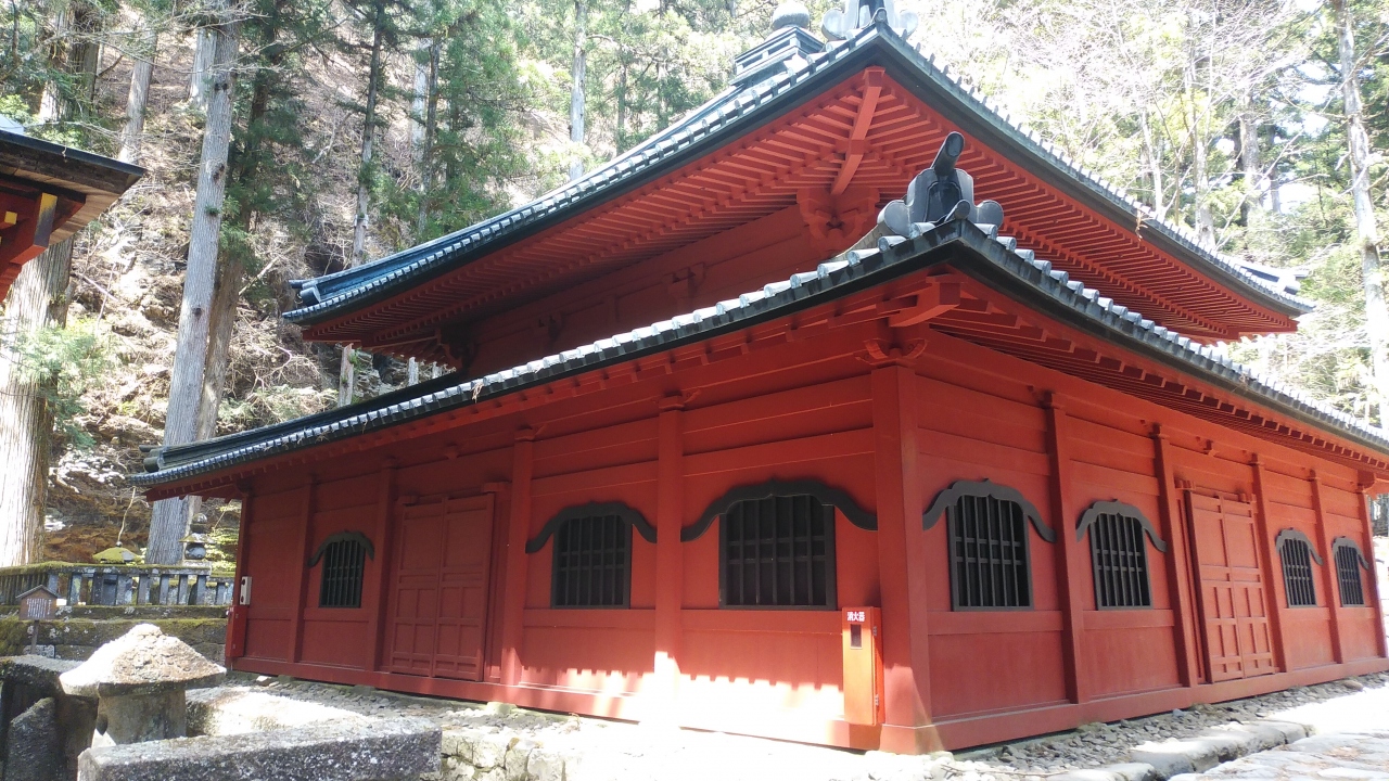 輪王寺開山堂として日光市山内の住所になっていますが、実質は日光東照宮の社務所から美術館方向に歩いた(登った)先にあり少し遠いです。勝道上人が弘仁8(817)年3月1日に遷化(死去)した時に火葬したのが現在の仏岩谷だそうです。その後に霊を祀るために朱塗りで重曹宝形造りという建築方法でお堂を建立しています。勝道上人と弟子10人の木像も本尊の左右に収められていて、お堂近くにも見るものが少しあり、山の上の平地のポツンと建っていて不思議な空間でした。