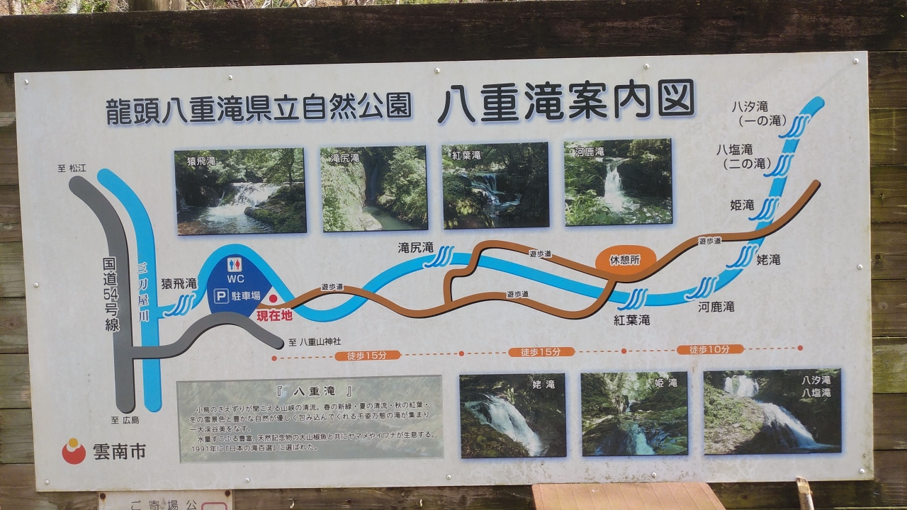仁多郡の桜井家庭園から一般道を通行し、国道54号線を若干広島方面に戻った場所にあります。国道から少し走ると駐車場があり、10台前後が駐車していましたが駐車場は広いです。駐車場から山道の遊歩道を約45分歩きましたが、途中に休憩所もあるのでゆっくり観光しましたが、結構水の音が大きくて少人数だとあまり気持ちの良いものではありません。でも滝は良かったです。