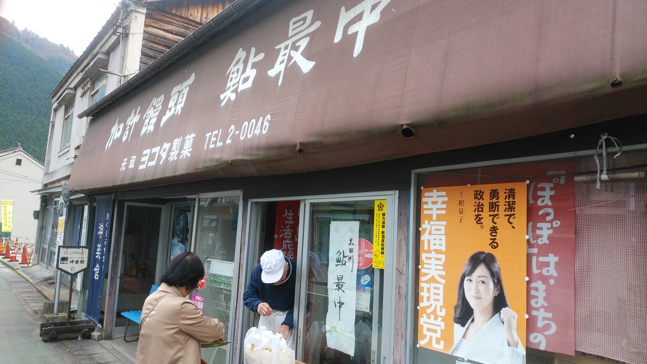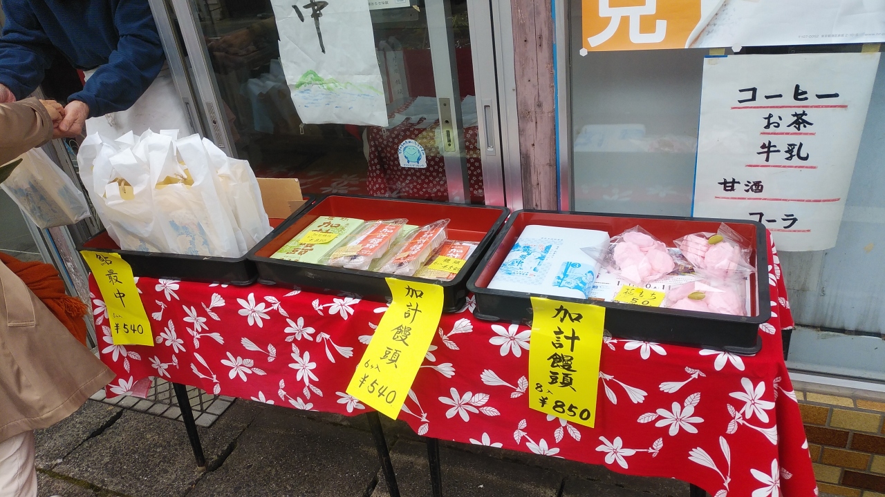 吉水園観光の後、有名な鯛焼を購入して車道を斜めに横切ると、加計饅頭