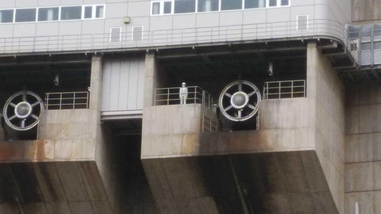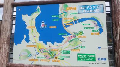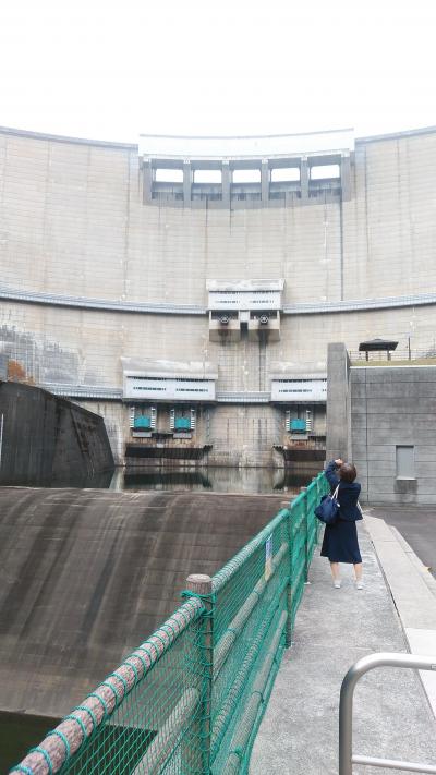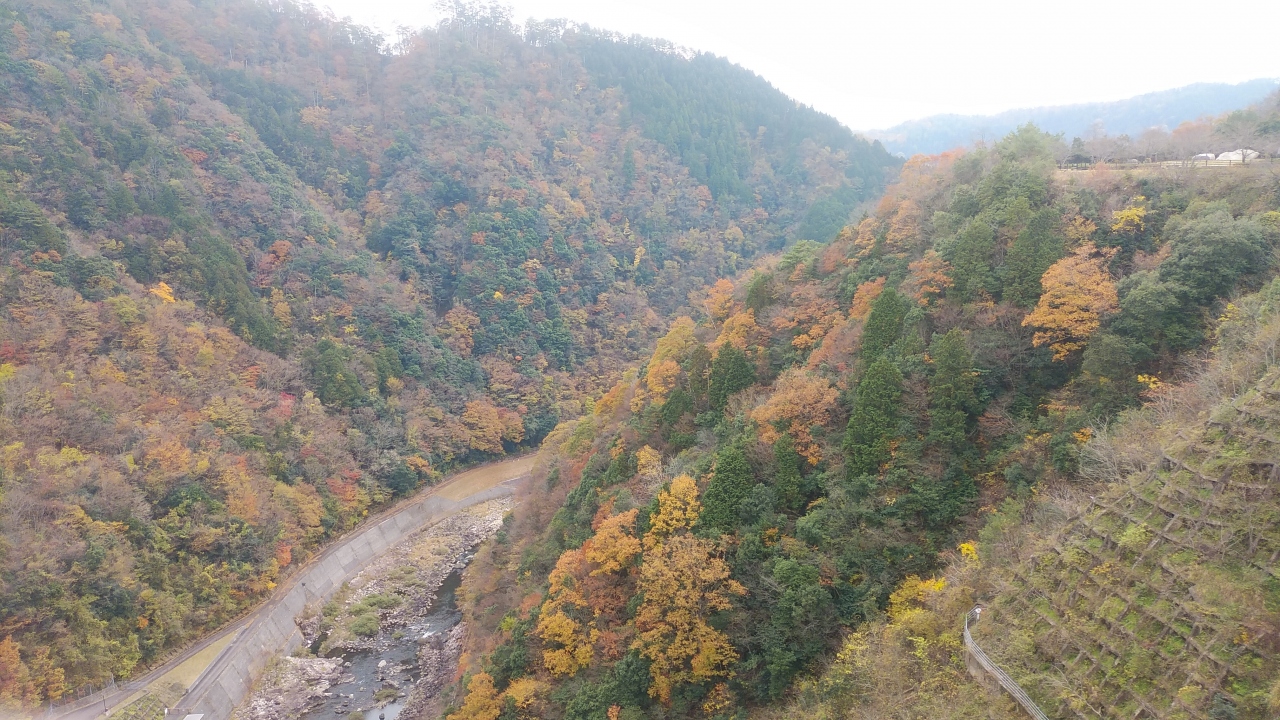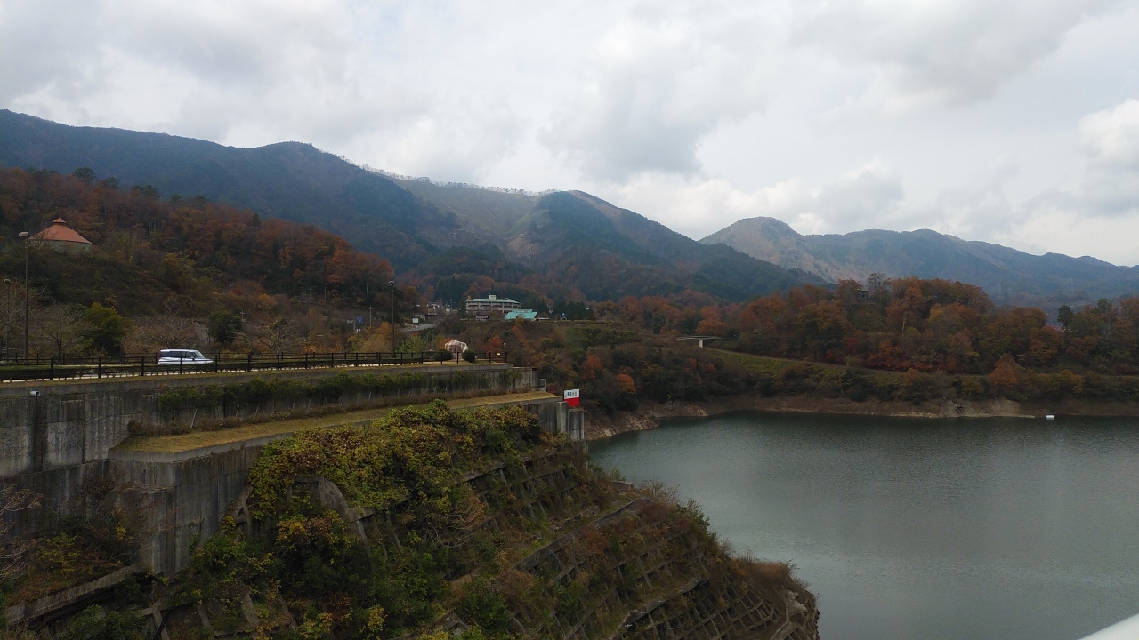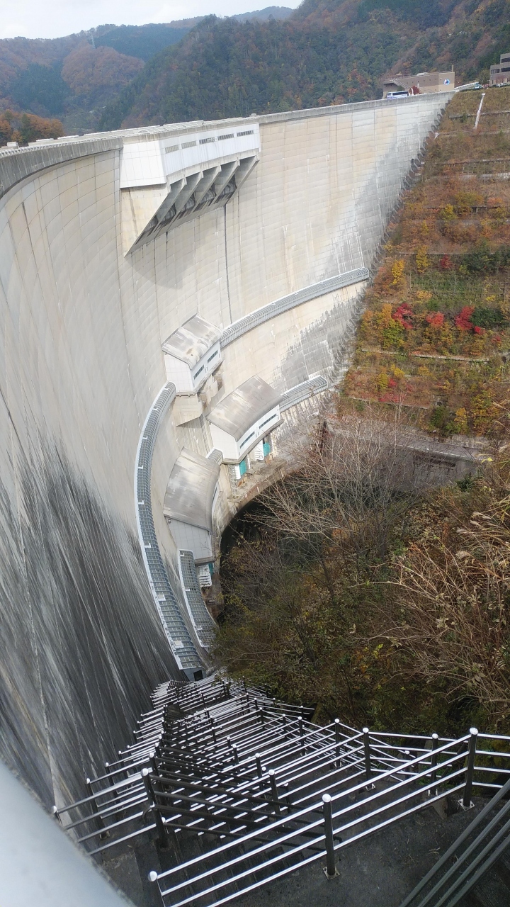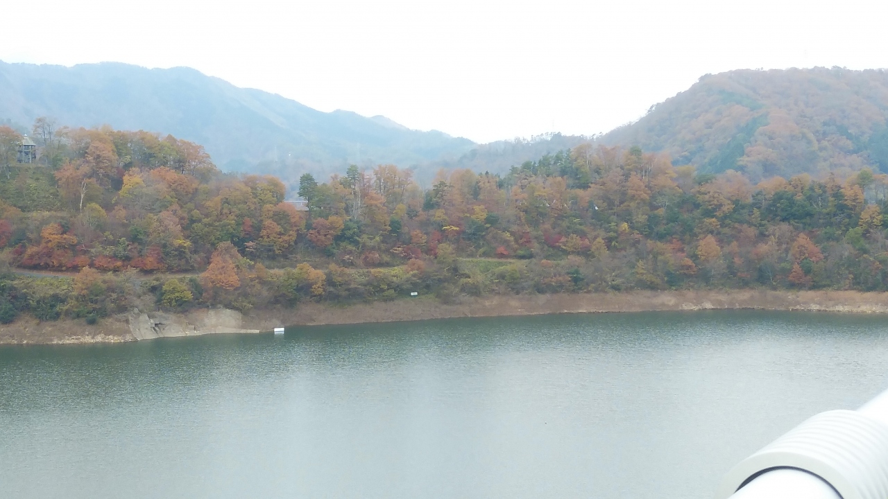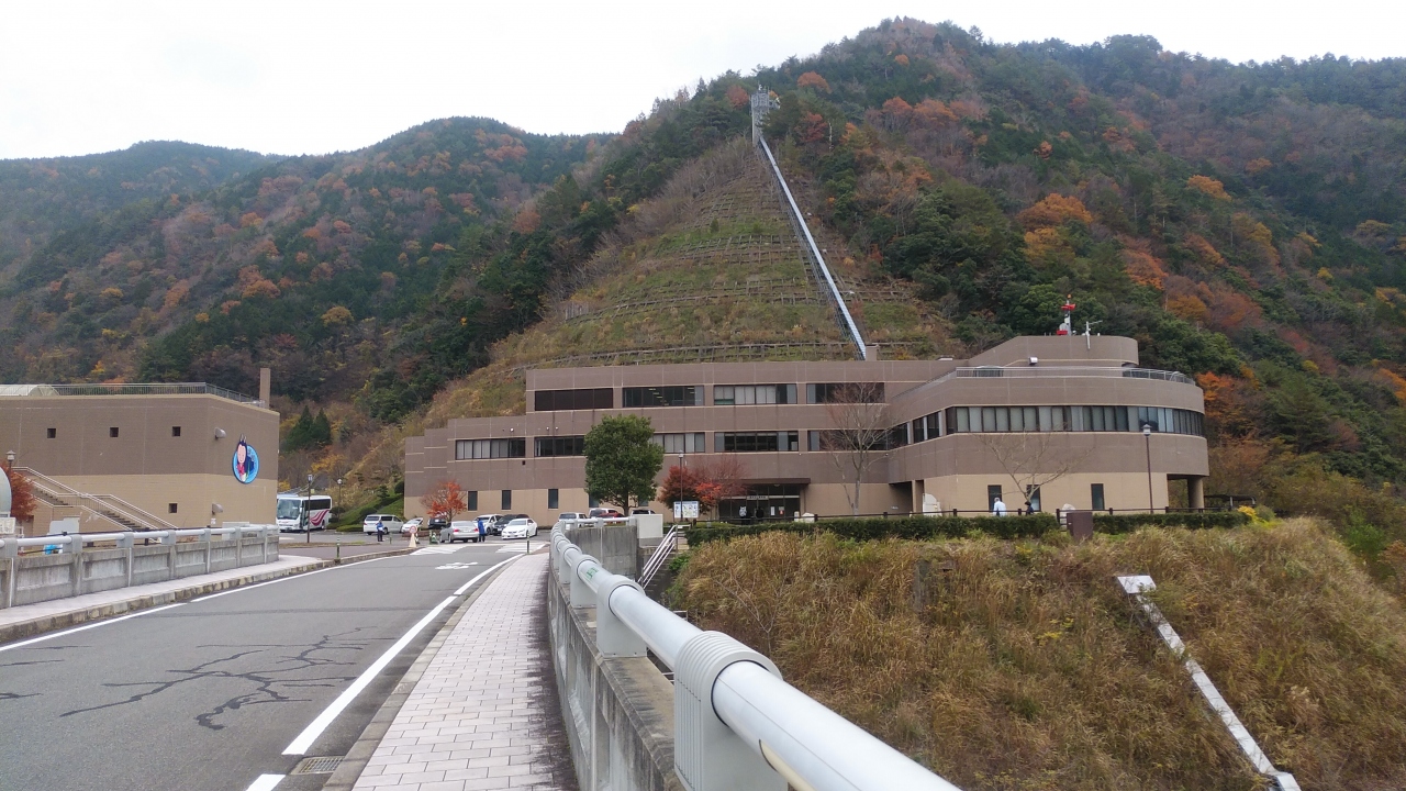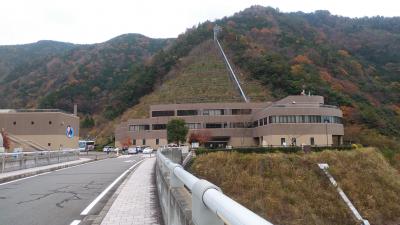 吉水園、深山峡と観光した後、ランチを済ませて紅葉を観に行きました。ダム側の駐車場に車を停めて、ダムの上を散策しましたが、高さ156mあり壮観でした。最近なのか最高位水位の看板がありましたが、この水位だとほぼ満杯状態なので怖いです。ダムの上からの紅葉は綺麗で、団体バスや自家用車で来ている方も多かったです。ダムの最下部に通ずるエレベーターに乗り地下4階相当を直行で降りました。そこから一番長いトンネルが100m、全長200mのトンネルを徒歩で外に出ると、放流する場所が見えます。放流する施設横には人形が立っていました。放流はしていませんでしたが、毎秒30トンもの爆流が貯水槽に落ちるそうです。10月下旬には龍姫湖まつりin温井ダムが開催されたそうで、紅葉以外にも沢山楽しめるようです。