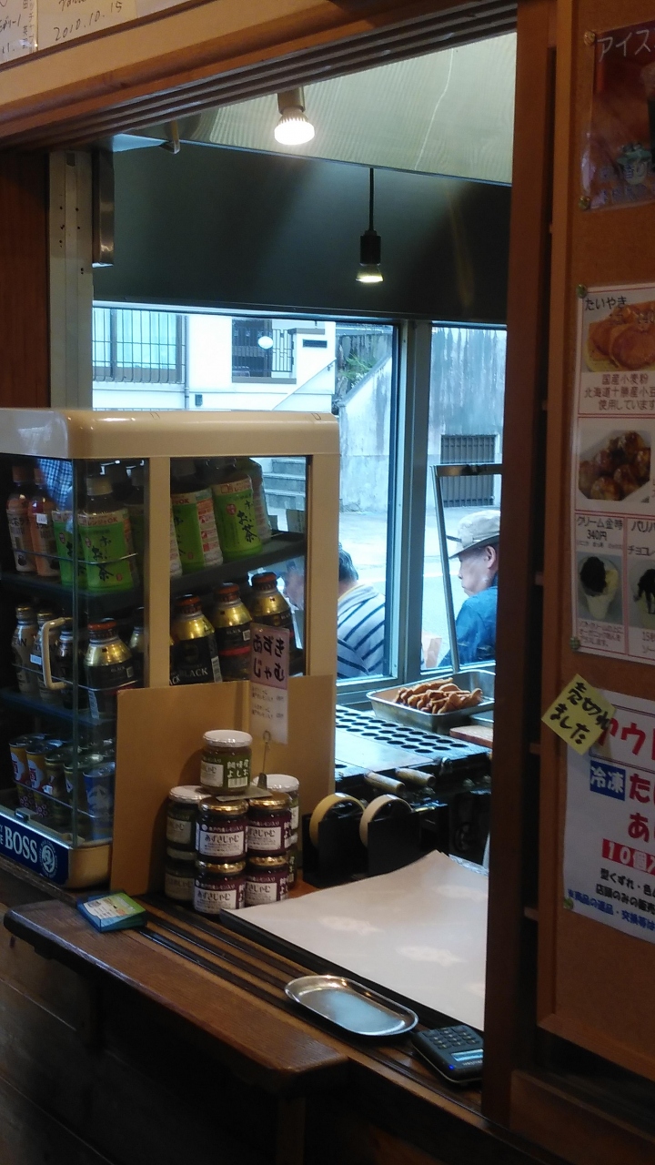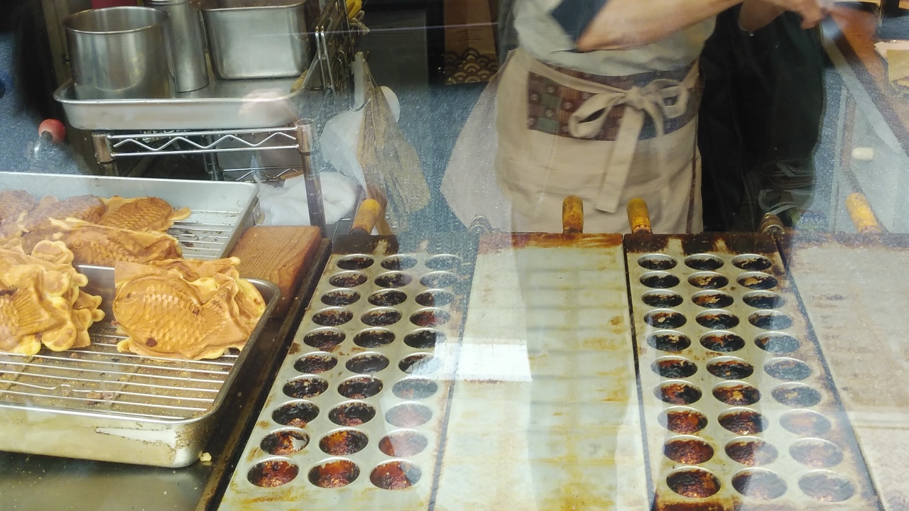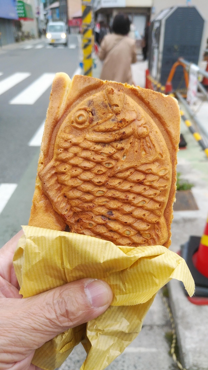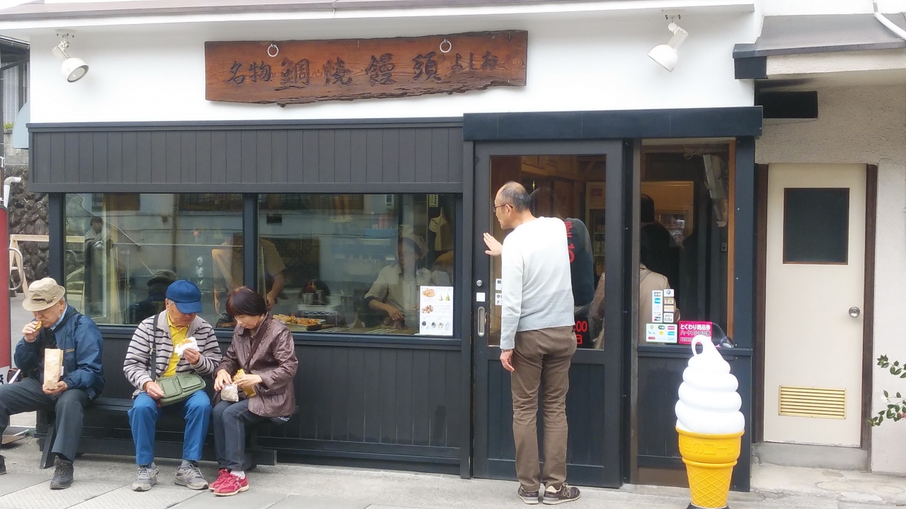 紅葉の名所で、年2回しか一般公開していない「吉水園」の帰りに観光客が、鯛焼を食べながら駐車場へ歩いていました。場所は吉水園から下って道路に出て右側の真っすぐ先のバス停前に人だかりしている処があったので行って見ました。店は大勢の人で溢れており、店内の壁には有名人の色紙が沢山掲げられていました。鯛焼は昔ながらの耳のある鯛焼で、皆さん店をでたら食べ歩きで帰路についていました。私達も店をでると斜め正面に「加計饅頭 鮎最中」があったので、最中を買って鯛焼を食べながら帰りました。餡子が沢山入っていて美味しかったです。
