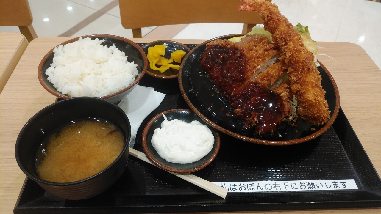 今日は、ゆめタウン広島へ買い物に行き、昼時間にランチを3階のフードコートで食べました。カツ丼が580円とリーズナブルですが、私はトンテキ定食、妻はエビトンカツ定食を注文。結構人気があり、注文して料理が出来るのを列を作って待ちます。並んだ人が注文した食べ物が解るので、人が注文した料理が解り、人のが良く見えます。トンテキは揚げ物をさけてカロリー抑制してエビトンとシェアーしましたが、トンテキも美味しかったでが、比較するとやっぱりエビトンカツがボリュームがあって美味しかったです。